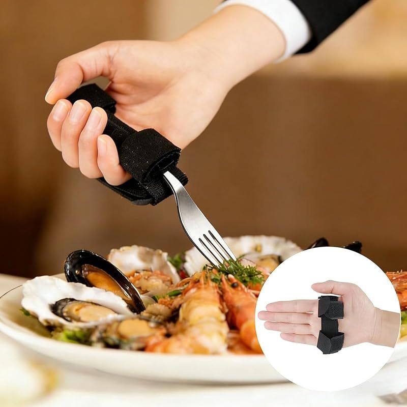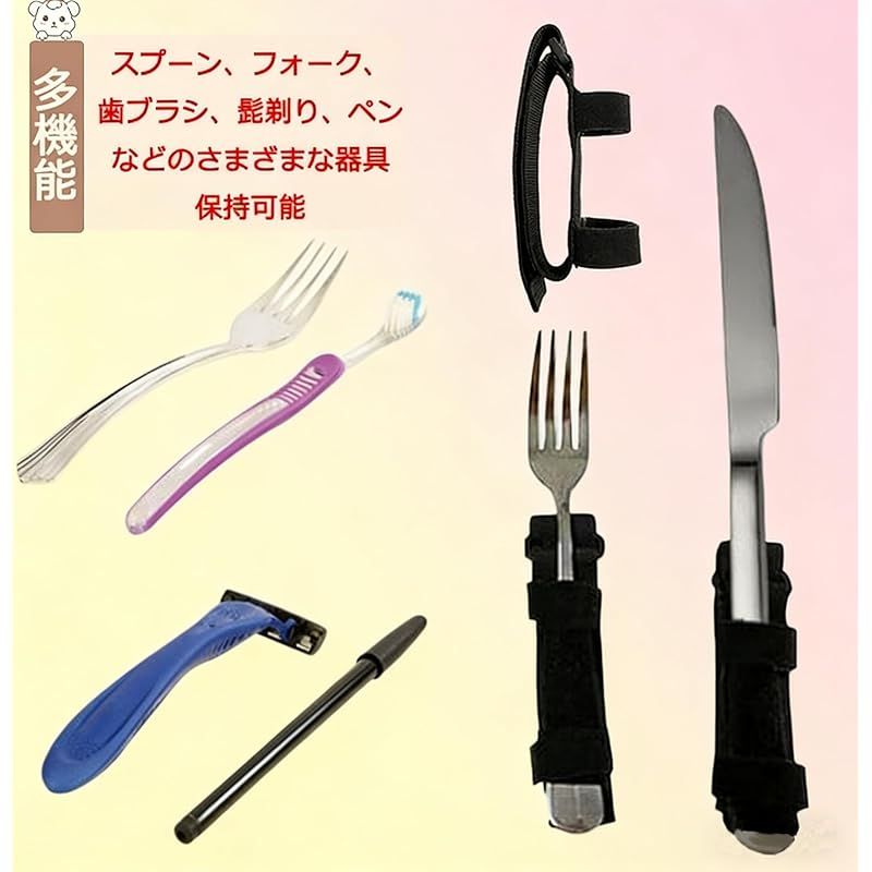【商品説明】 手指に力の入らない、フォーク/スプーンなどの食具を手で持ちづらくなってきたご高齢者、お年寄りの方、関節炎、手の怪我、握力が弱い方身体の不自由な方などのために設計された食事補助具。 食事補助バンドは器具の滑り止めを防止し、グリップ力をアップし、手を握りやすくなり、摂食の自信を高めるので、生活での自立をしっかりサポートします。お年寄りの方や障害者へのお見舞い、敬老の日プレゼントとしても適用。 折りたたみサイズ:長さ約10cm、幅:3.5cm 材質:ポリエステルとナイロン 重量:56g カラー:ブラック パッケージ:食事補助バンド*1(スプーンやフォークは別売り) 特徴:サイズ調節可能、多機能、軽量、丈夫、耐久性、携帯便利 オススメ対象:細いものを握る動作が困難なご高齢者、お年寄りの方、関節炎、手の怪我、身体の不自由な方 ご注意 モニターの環境により色の見え方に若 干差が生じる場合がございます。 手 作業で計測して おりますので、サイズに多少の誤差がある 場合がございます。あらかじめご了承下 さい。 商品の品質について 不備、不良、破損などがご ざいましたら、ぜひご連絡してお願いし ます絶対責任を取りますから、ご安心にご注文してください。