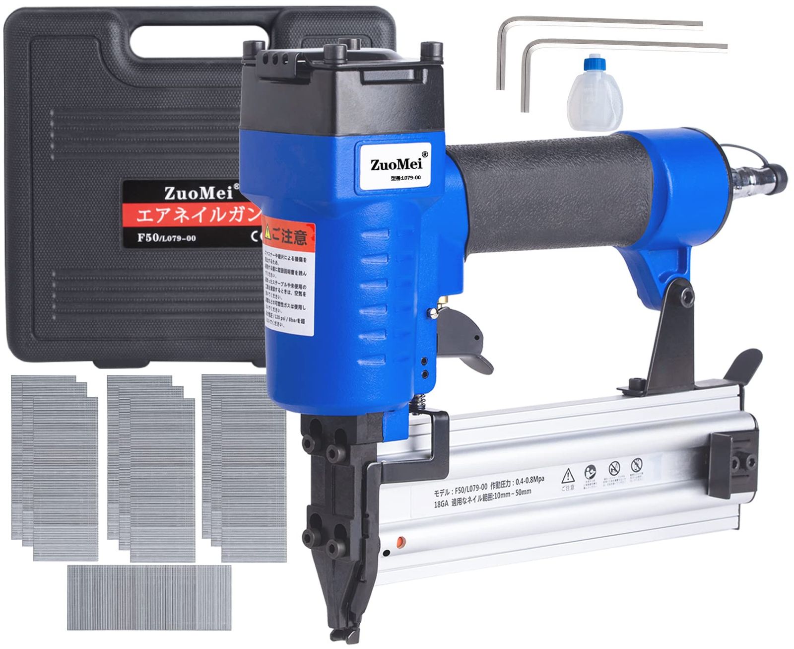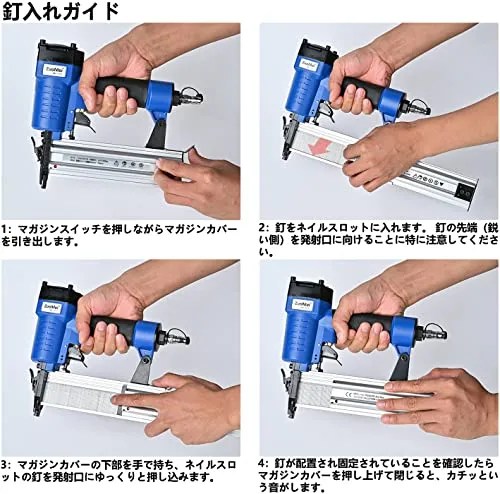【パラメータ / セット内容】使用空気圧力範囲0.4-0.8mpa、最大使用空気圧力1mpa、打つ回数:10万回 、使用可能な釘の長さ:15-50MM 装填数:100針 本体重量:1.2kg / タッカー本体1、釘1000枚、日本語説明書1、六角レンチ2、ネイルガン収納ボックス1、 (画像展示部品はすべてあります)