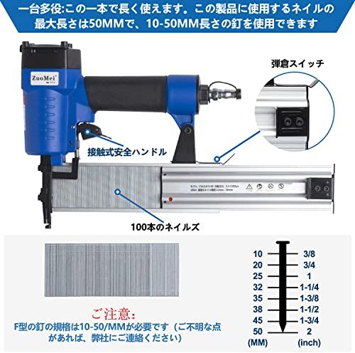 【商品特徴2】多規格な釘が使用可能、コスト節約:F型長さ1050mmの釘はすべて使用でき、現在市場のネイル仕様の単一の問題を解決します。(ほかの釘打ち機は釘の最大使用可能な長さは20MM、25MM、35MMなど)いくつかの釘打ち機を買う必要がなく、お金を節約できます。