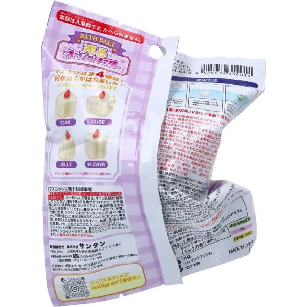 【使用上の注意】 ・本製品・包装材は飲食物ではありません。口の中には絶対に入れないでください。窒息などの原因となります。また、小さなお子様には絶対に与えないでください。 ・小さな部品がありますので、7才未満のお子様には絶対に与えないでください。誤飲による窒息などの原因となります。 ・本製品は入浴料です。万一、入浴料および入浴料を溶かしたお湯を口に含んだ場合は、すぐにはき出させ、水を飲ませてください。 ・入浴料および入浴料を溶かしたお湯が目に入った場合は、真水ですぐに洗い流し、異常があらわれた場合は医師の診察を受けてください。 ・本製品がお肌に合わないとき即ち次のような場合には、使用を中止してください。そのまま本製品のご使用を続けますと、症状を悪化させることがありますので、皮膚科専門医等にご相談されることをおすすめします。 (1)使用中、赤み、はれ、かゆみ、刺激等の異常があらわれた場合。 (2)使用したお肌に、直射日光が当たって上記のような異常があらわれた場合。 ・高温・多湿・直射日光の当たる場所はさけて保存してください。 ・入浴料を溶かしたお湯は必ずよく混ぜてから入ってください。溶けきれない成分が浴槽に残り、滑って転倒するなどの危険があります。 ・使用後は浴槽、風呂釜などをよく洗い流してください。 ・循環式・大理石・檜の浴槽では使用しないでください。 ・残り湯は洗濯に使用しないでください。 ・開封後はすぐにご使用ください。 ・湯沸かし方式のお風呂で本製品を使用したお湯を追いだきしないでください。風呂釜に汚れが付着する場合があります。 ・使用後にお湯を抜く際、必ずマスコットを取り出してからおこなってください。排水溝が詰まる原因となります。 ・マスコットの塗料がはがれる行為(固い物でこする、入浴料から無理に取り出すなど)はしないでください。 ・保存の状態により、未開封の物でも発泡が弱くなる恐れがありますが、使用していただくには問題はありません。 ・入浴以外の用途では使用しないでください。 ・お子様の手の届かないところに保管し、お子様がご使用になる場合には保護者の監督のもとで使用させてください。 ・お客様のお手元に届くまでに発生してしまうごく微量な炭酸ガスを抜く為、袋に小さな穴を開けています。袋の破裂防止で、商品機能への影響はありません。
