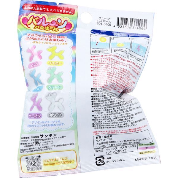 【商品について】 シュワたま バルーン バスボール レモンの香り 75g 1回分 ※単品販売(種類指定不可) マスコットの種類は全部で6種類。(※いずれが1つが入ってます。※マスコットの種類は選べません。) 株式会社サンタン 個装サイズ:110X140X55mm 個装重量:約100g 内容量:75g×1個入 ケースサイズ:28X32X80cm ケース重量:約14kg 製造国:中国
