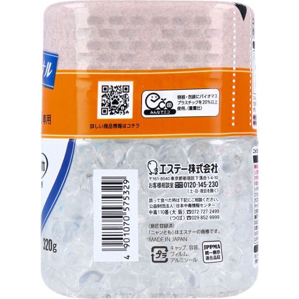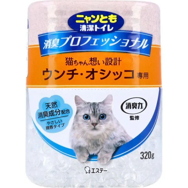 【商品について】 ニャンとも清潔トイレ 消臭プロフェッショナル ウンチ・オシッコ専用 ビーズ 微香タイプ 320g エステー株式会社 個装サイズ:92X121X92mm 個装重量:約410g 内容量:320g ケースサイズ:39.6X26.5X20.2cm ケース重量:約6.8kg 製造国:日本