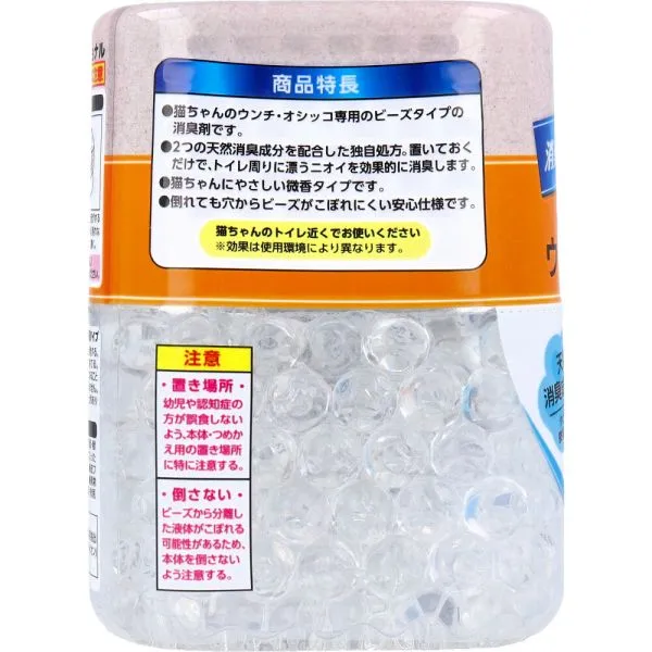 【使用上の注意】 ・本品は食べられない。 ・誤って食べると、気管をつまらせるなど重症になる恐れがあるため、幼児や認知症の方の手の届かないところで保管・使用する。 ・ペットが本品で遊んだり、誤って口に入れたりしないよう充分注意する。 ・ビーズがこぼれる可能性があるため、変形したキャップは使用しない。 ・ビーズや分離した液体がこぼれた場合はすぐに拭き取る。 ・落下・転倒・破損させない。 ・高温になるところや直射日光の当たるところには置かない。 ・膨らんでつまりの原因となるため排水口には流さない。 ・用途以外に使用しない。 ・使用期間中はパッケージを保管する。 ・使用後は地域の規則に従って捨てる。 ・使用に伴いビーズが黄色や白色になることがありますが、品質・性能上問題ありません。 ・液体がビーズから分離することがありますが、性能上問題ありません。 ・幼児や認知症の方が誤食しないよう、本体・つめかえ用の置き場所に特に注意する。 ・ビーズから分離した液体がこぼれる可能性があるため、本体を倒さないよう注意する。