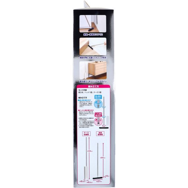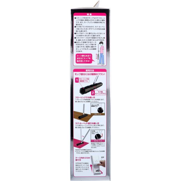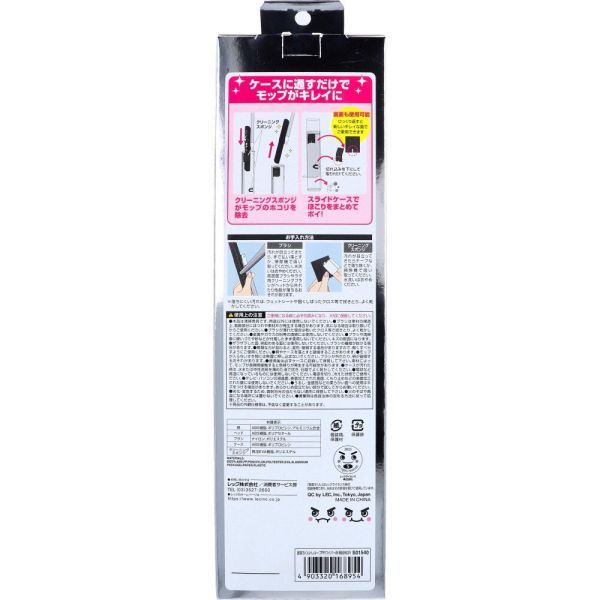 【使用上の注意】 ・本品は清掃用具です。用途以外には使用しないでください。 ・ブラシは素材の構造上、裁断部分にほつれや素材片が発生する場合があります。気になる場合は取り除いてからご使用ください。 ・ブラシが濡れた場合は乾いたクロス等で拭きとり、よく乾かしてください。 ・金属やガラスの粉等の清掃には使用しないでください。 ・ブラシや清掃面に固いゴミや砂などが付着したまま使用しないでください。キズの原因になります。 ・ザラザラした面、突起のある面には使用しないでください。ブラシの繊維が抜ける場合があります。 ・無理な力が加わると、破損する場合がありますので、軽くすべらすようにご使用ください。 ・モップの先端を曲げたまま長時間放置しないでください。変形の原因となります。 ・柄やケースを落とすと損することがあります。 ・モップが入らないすき間には無理に押し込まないでください。ブラシが外れたり柄が破損するおそれがあります。 ・伸縮する際、指ををはさまないようご注意ください。 ・ヘッドを下に向けて立てかけないでください。ヘッドが変形・破損することがあります。 ・使用後は必ずケースに収納して保管してください。素材によって、モップが長期間接触すると色 が発生する可能性があります。 ・ケースが汚れた時は、水または中性洗剤を薄めた液で拭き、日陰でよく乾かしてください。 ・電球など高温になっているものには使用しないでください。電源を切り、冷えた状態でご使用ください。 ・テレビ・パソコンの液晶画面、表面加工された画面、くもり止めなどの加工された鏡には使用しないでください。 ・うるし・金銀箔などの柔らかい面への使用はキズをつける場合があります。あらかじめ目立たない部分で試してからお使いください。 ・劣化・変色するため、直射日光の当たらない場所に保管してください。 ・火のそばや高温になる所には置かないでください。 ・廃棄時は各自体の定める方法に従って処理してください。