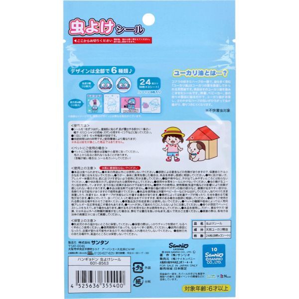 【商品について】 ハンギョドン 虫よけシール 24枚入 株式会社サンタン 個装サイズ:112X193X2mm 個装重量:約10g 内容量:24枚入(8柄×3シート) ケースサイズ:36X12X41cm ケース重量:約2.5kg 製造国:日本