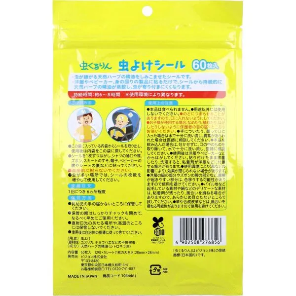 【ご使用方法】 ・この袋に入っている内袋からシールを取り出し、使用後は内袋をこの袋に戻してください。 ・シールを1枚ずつはがし、シャツの袖口や襟、ズボン、スカートのすそ、帽子、ベビーカーの幌やシートの裏などに貼ってください。 ・直接肌に貼らないでください。 ・虫が多い場所では、シールの枚数を増やして使用してください。