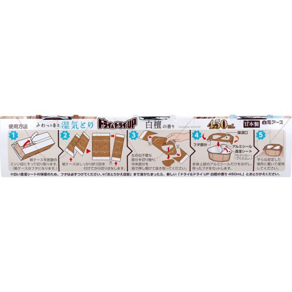 【使用方法】 (1)紙ケースを底面のミシン目にそって切り取ります。(紙ケースはフタになります。) (2)紙ケースはしっかり折り目を付けてから切りはなします。 (3)左右の不要な部分を切り取り、中央部分を指で押し開けて抜き取ってください。 (4)本体上部のアルミシールだけをはがし、作ったフタをセットします。 (5)平らな安定した場所に置いて使用してください。 ※白い透湿シートの保護のため、フタは必ずつけてください。 ※「おとりかえ目安」まで液がたまったら、新しい「ドライ&ドライUP 白檀の香り 450mL」とおとりかえください。