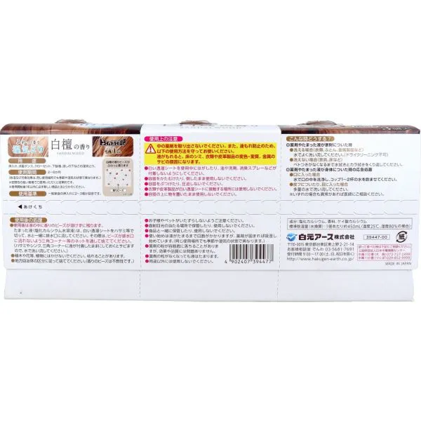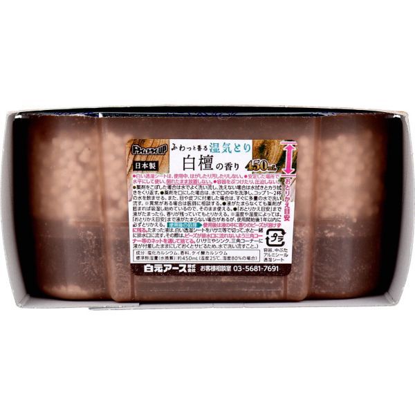 【商品について】 ドライ&ドライUP 湿気とり 白檀の香り 450mL×3個入 白元アース株式会社 個装サイズ:300X65X138mm 個装重量:約693g 内容量:450mL×3個入 ケースサイズ:42X34X31.5cm ケース重量:約11.6kg 製造国:日本