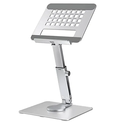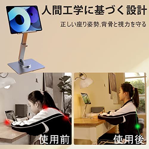 【高さ&角度調整可能】このタブレットホルダーは高品質のアルミニウム合金で作られ、エッジは丁寧に研磨され、滑らかで手に傷がつきません。アップグレードされた人間工学に基づいたデザインで、5.1cmから35.7cmまで自由に角度と高さを調整することができます。姿勢の改善に役立ち、肩、背中、首への負担を軽減し、猫背を効果的に防ぐことができます。