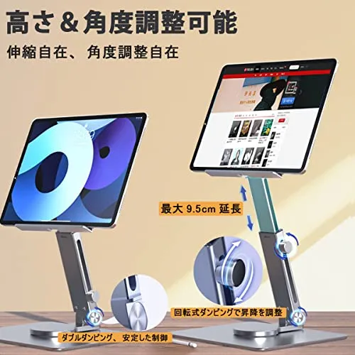 【360度回転設計】iPadスタンドはダンピングギア構造を採用し、水平角度を無段階に調整できます。会議、勉強の時、頻繁に動かなくても、スタンドを回転させるだけで、他の人と簡単に画面を共有することができます。また、自由な角度で固定できるため、iPadやタブレットを長時間使用しても疲れにくい設計になっています。
