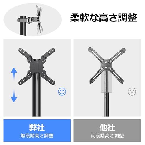 【安心安全】安全面に妥協出来ない頑丈な自立式デザインです。高品質の冷間圧延鋼がコア材料で、頑丈で耐久性のあるモニタースタンドを提供する、最大耐荷重は20kgでほぼ50インチ以下のテレビが全部問題なし対応出来ます。キャスターもブレーキ付きで安定性抜群です。