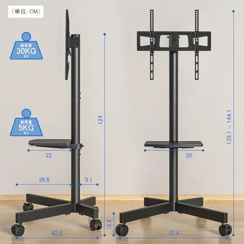 VESA対応:テレビスタンドのVESAは(テレビ背面のネジ穴間の距離)100x100 mmから400x400 mmまで対応可能です。このキャスター付きテレビスタンドが23から60インチまでのテレビやモニターの大部分に対応しています。本体耐荷重:30KG。