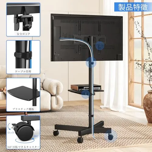 移動便利、安全安定:スタンドはキャスターが付きなので、360回転でき、一人でも楽に移動可能です。前輪には足で操作できるストッパーを搭載しているのでしゃがむことなく、スムーズに固定できます。支柱は合金鋼製でしっかりしているので、リビングルーム、事務室、展示会、会議室及び学校で多様なシーンでもこのスタンドを使いできます。