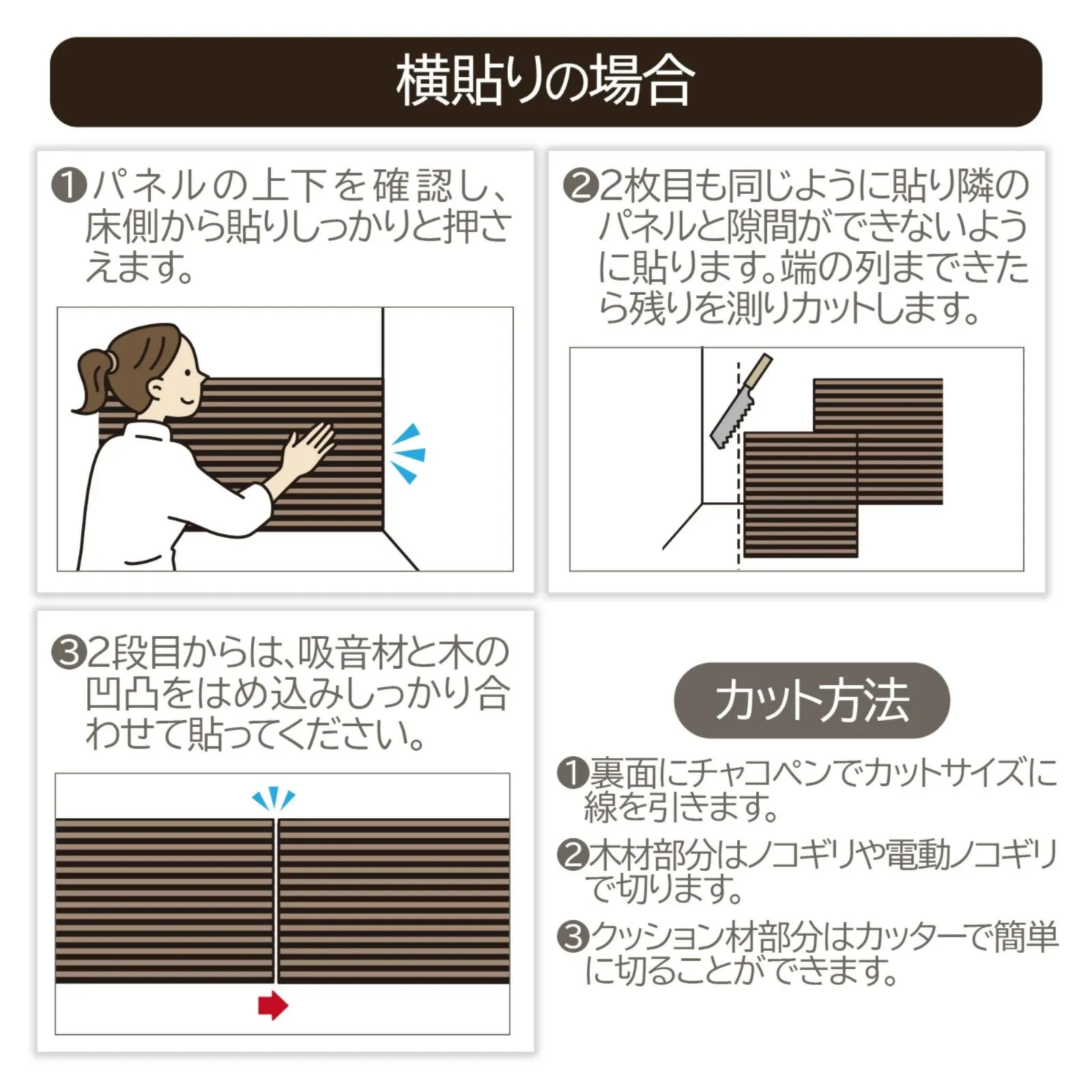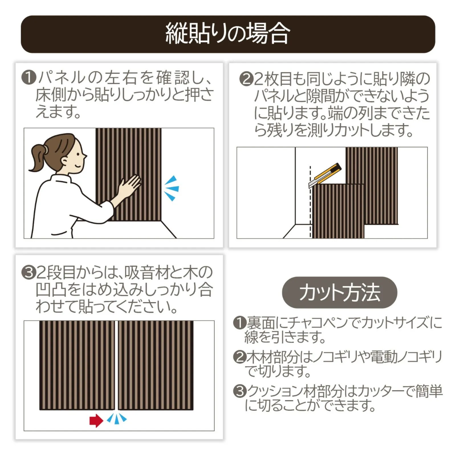 【商品仕様】 材質:天然木目の圧板 + 中密度繊維板 + 高密度吸音ポリエステル繊維 重量:1枚約1.95kg サイズ:1枚約80×30×2.2cm(6枚入り) カラー:ブラウン(Walnut.JK、茶色) 施工面積:1.44 平方メートル