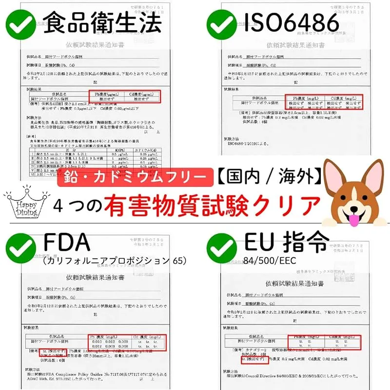 【人と同じ安全基準をクリアしています。「鉛・カドミウムフリー」】 人間よりもずっと犬の体は小さい 。 少量の有害物質でも人が受ける影響よりも、犬の受ける影響は大きい。 大切な犬の為、人と同じ安全基準をクリアした食器を選んであげましょう。 猫壱のハッピーダイニング食器は、国内外の安全基準をクリアした「鉛・カドミウムフリー」です。 (食品衛生法・ISO6486・FDAカリフォルニアプロポジション65・EU指令84/550/EEC)