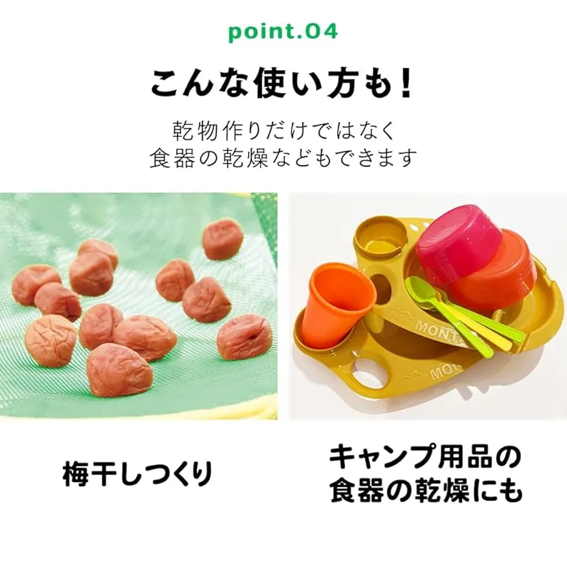 【こんな使い方も】乾物作りだけではなく、梅干し作りやアウトドアでのキャンプ用品の食器の乾燥などもできます。