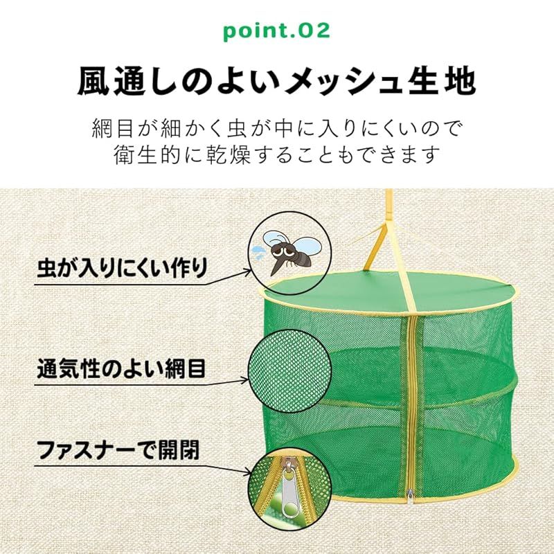 【風通しのよいメッシュ生地】通気性のよい網目が細かく虫が中に入りにくいので衛生的に乾燥することもできます。ファスナー仕様なのでラクラク開閉。