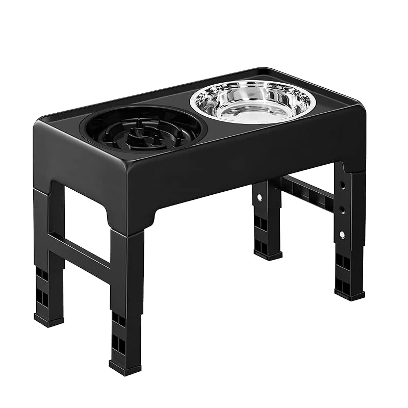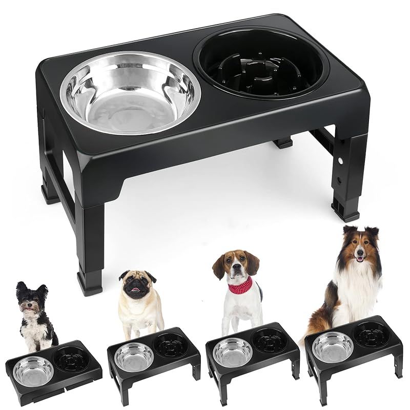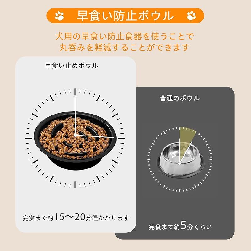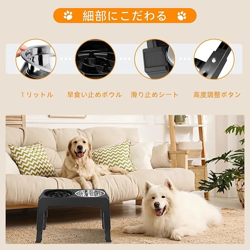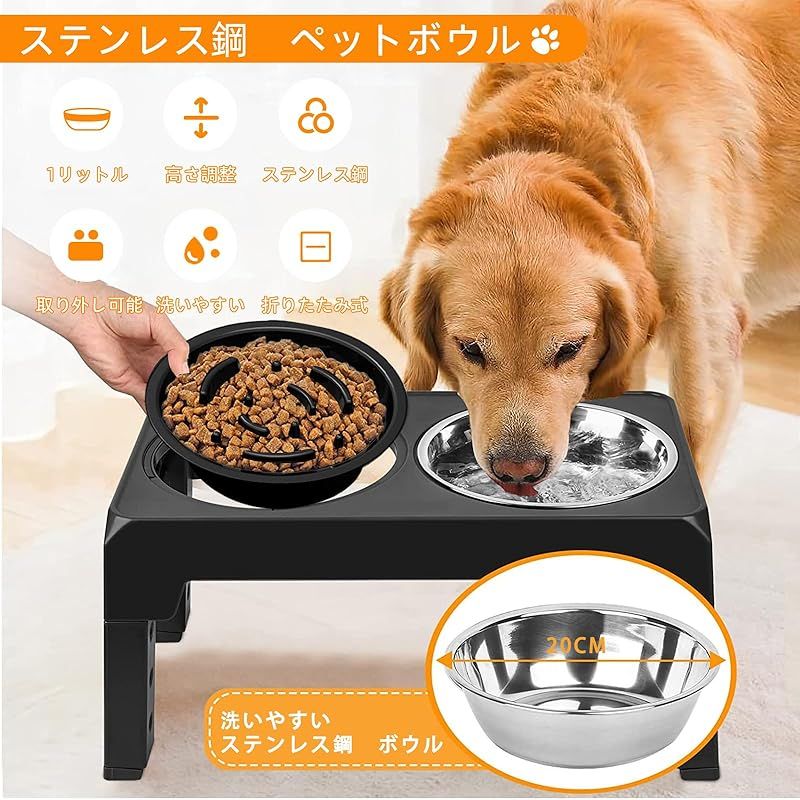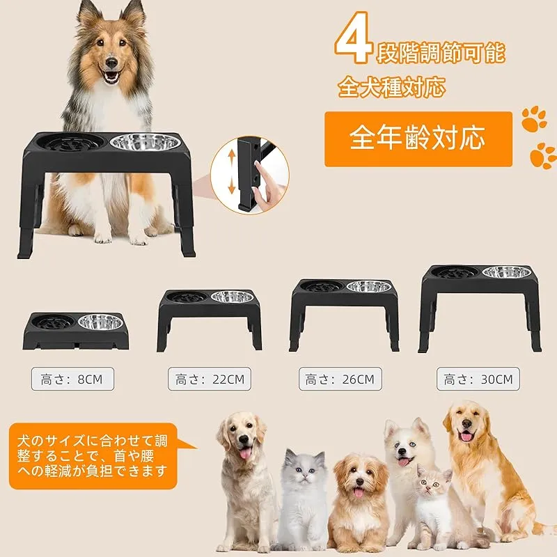 【商品概要】 幅広い適用性:8CM、22CM、26CM、30CM、4段階の高さが調節可能で、年齢を問わず各成長段階のペットに対応できます。大型犬に対して、長期的に腰を曲げて食事をすると脊柱に圧力がかかり、適切な高さが関節や首の圧力を軽減し、より良い姿勢の養成に役立ちます。 大容量早食い防止ボウル:内口径約20cm、最低口径13cm、深さ6cm、容量1000mlの早食い防止ボウル1個付いて、ボウルにに凸凹があることにより、食事の速度を効菓的に減らすことができます。早食い防止、肥満を防止し、健康的な食べ方を促進するダイエット食器です。 大容量ステンレスボウル:内口径約20cm、最低口径13cm、深さ6.5cm、容量1000mlのステンレスボウルは1個付いて、軽くて、頑丈で、錆びず、取り外して水洗いできて、細菌の繁殖を防止します。水とフードをそれぞれ2つのボウルに入れられて、多頭の犬を同時に飼育場合にも適用します。 滑り止めテープ:ボウルを置くスタンドの縁とスタンドの底に滑り止めテープが付いており、安定性抜群です。食べる時の揺れること、移動する際の騒音とキズにも有効的に防ぎます。 上質な素材:2つのボウルはそれぞれステンレス製とPP素材を採用していて、軽量、安全、無毒で、愛犬にぴったりです。ABS材質で全体のフレームを作り、優れた折り畳み設計を採用し、収納が便利で、デザインが簡潔で美しく、脚を取り外す必要なく、高さを調整できます。どこに置いても高級感が溢れています。