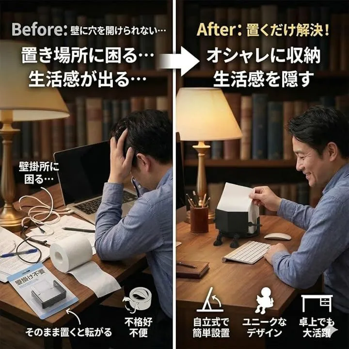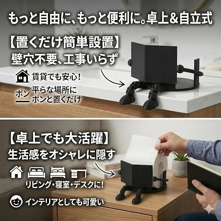 「トイレ以外のインテリアにも」 トイレットペーパーだけでなく、卓上用のロールティッシュスタンドとしても大活躍。