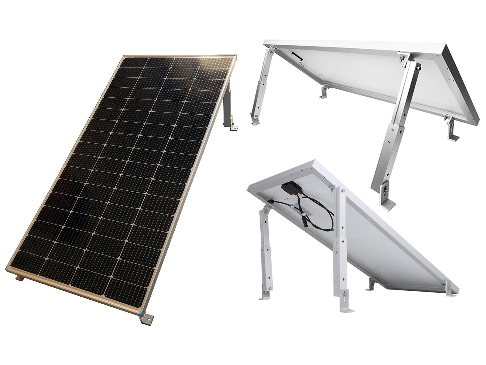 ■脱着式架台を備えた太陽電池パネルです。縦横いずれの方向でも角度調節できますので、 様々な場所に設置ができます。