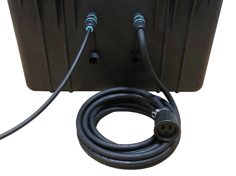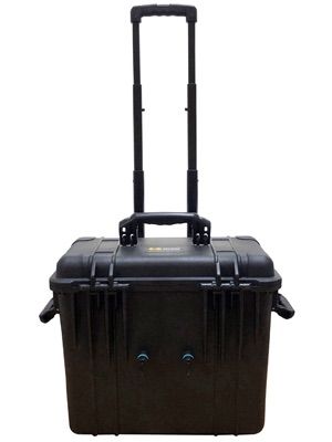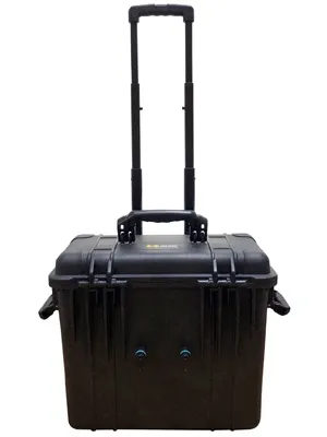 ■電池は、内圧調整機能付きで安全な、保護等級IP67防水・防塵仕様の米国ペリカンケースに内蔵しています。持ち運びに便利な伸縮ハンドルとキャスター付きです。