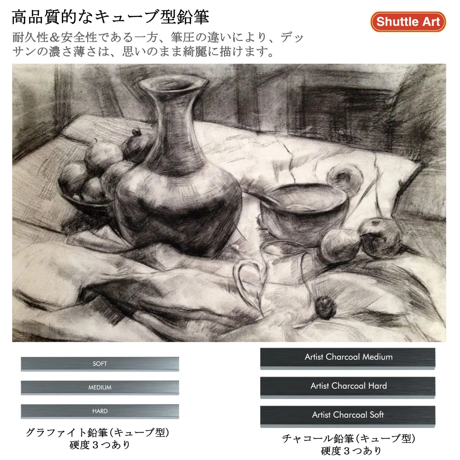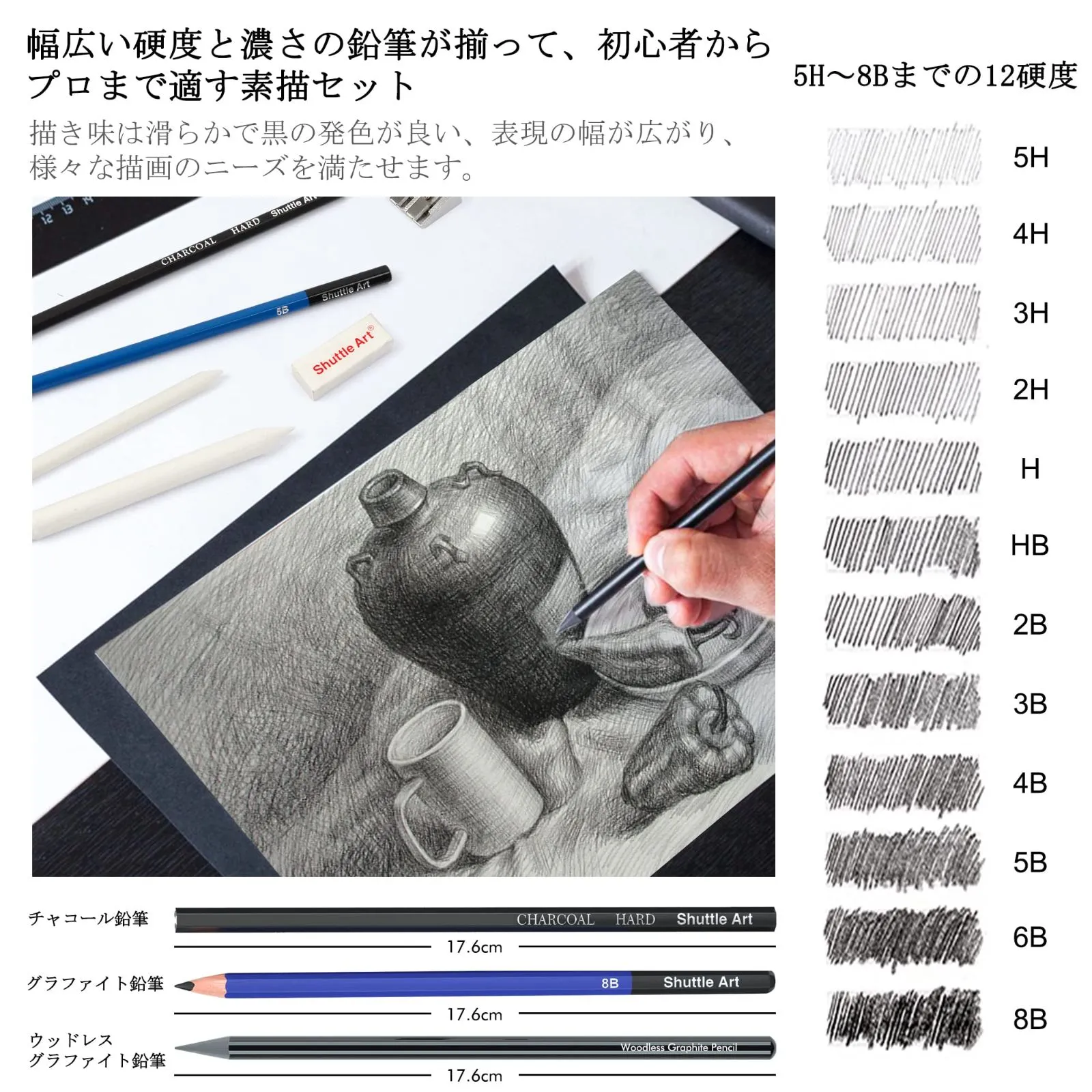 【豊富なバリエーション】5H、4H、3H、2H、HB、B、2B、3B、4B、5B、6B、8B、幅広い硬度と濃さの鉛筆が揃っています。表現の幅が広がり、デッサンの濃さ薄さは、思いのまま綺麗に描けます。芯が柔らかくて、折れにくく磨耗が少ないです。描き味も滑らかで、黒の発色がとても綺麗です。シャープナー、消しゴムやカッターナイフなど必要な道具が付いているので、簡単に素描絵を楽しめ、ご使用中の色々なニーズを満たせる素描鉛筆セットです。