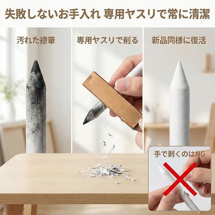 さらに、プロの技法である「使い分け」を可能にするため、特性の異なる2種類の擦筆(さっぴつ)を計8本同梱しました。