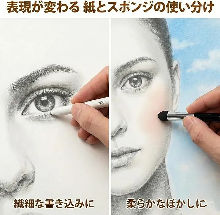 「素材による使い分けで、表現力アップ」 ・紙擦筆(#1-#6):鉛筆の粉を紙の繊維にしっかり押し込むのに最適。