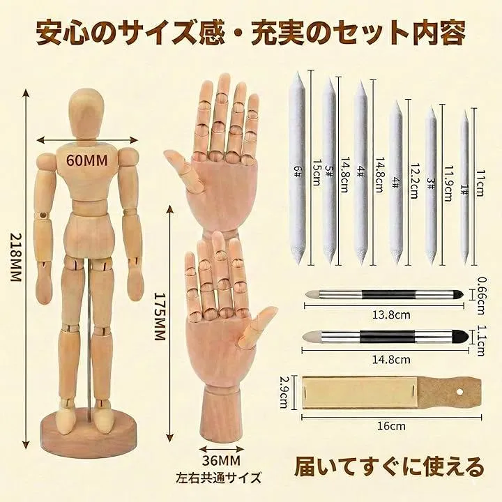 「セット詳細」 ・デッサン人形(人型):1体(高さ21.8cm / 幅6cm) ・ハンドモデル:右手1個、左手1個(高さ17.5cm / 幅3.6cm) ・紙擦筆:6サイズ(#1~#6) ・スポンジ擦筆:2サイズ(大小) ・研磨用紙ヤスリ:1本