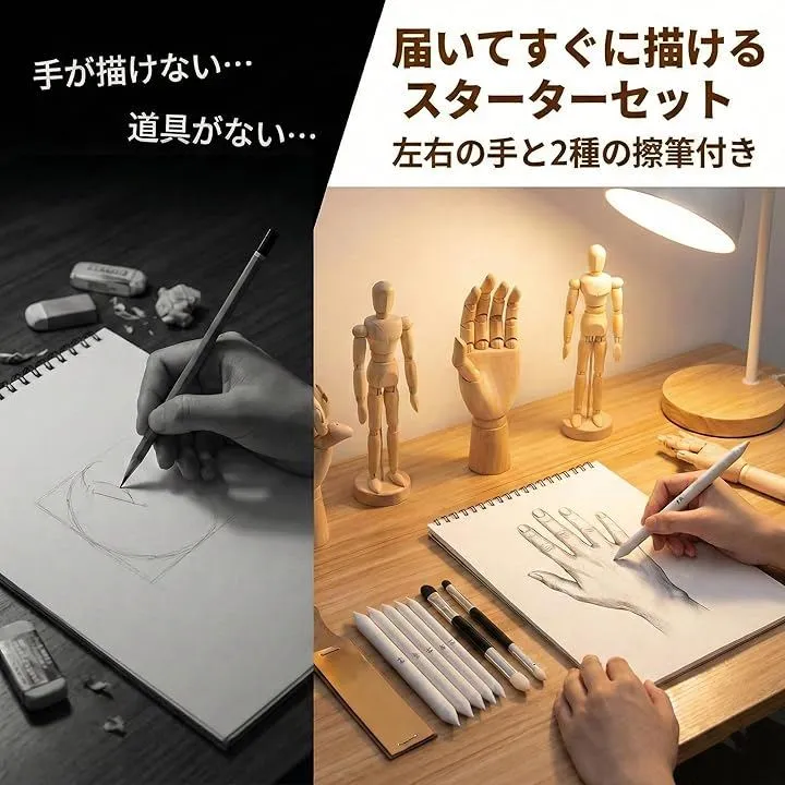 「手がうまく描けない」「全身のパースが崩れてしまう」「影の付け方が単調になる」 そんなイラスト制作の悩みを解決するための厳選したデッサンモデルと本格画材のフルセットです。