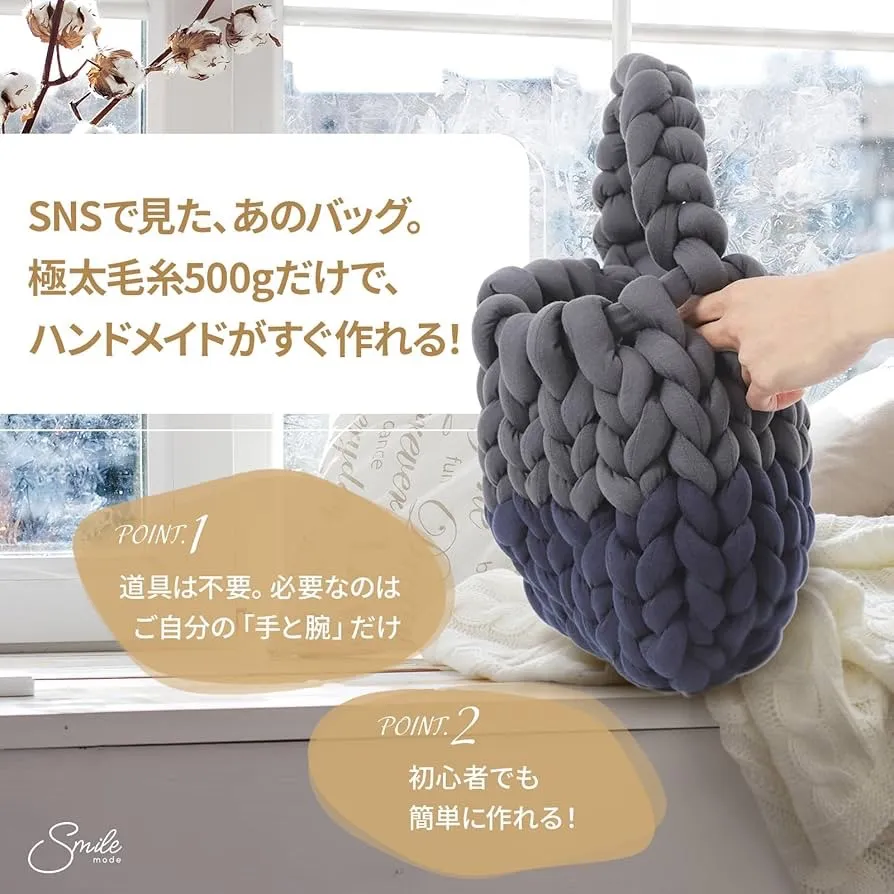 【憧れのマンドゥバッグをご自宅で】 SNSで話題の韓国風「マンドゥバッグ」が、初心者でも驚くほど簡単に作れるチャンキーニットです。必要なのはこの極太毛糸500gとあなたの腕だけ。特別な道具は不要で、届いたその日からハンドメイドをお楽しみいただけます。