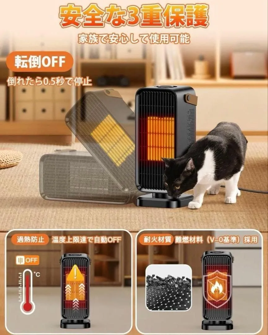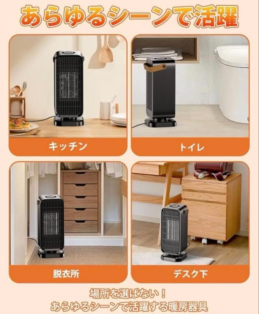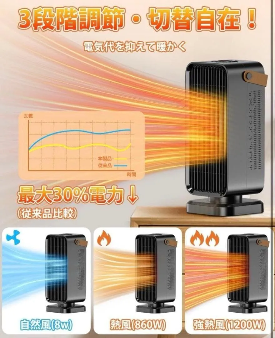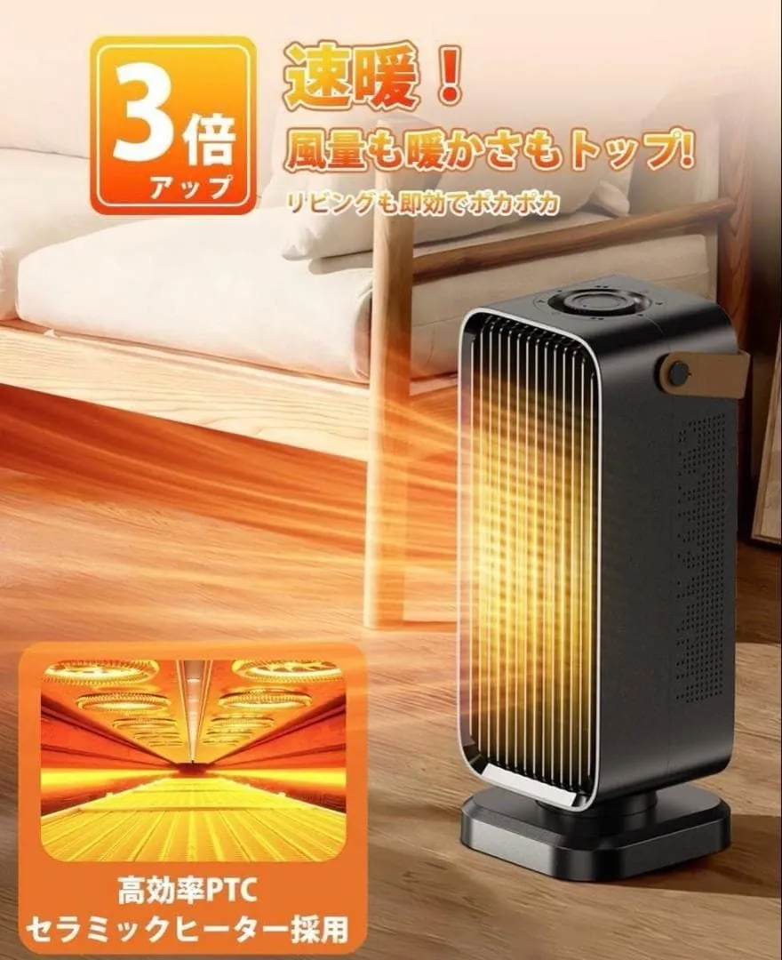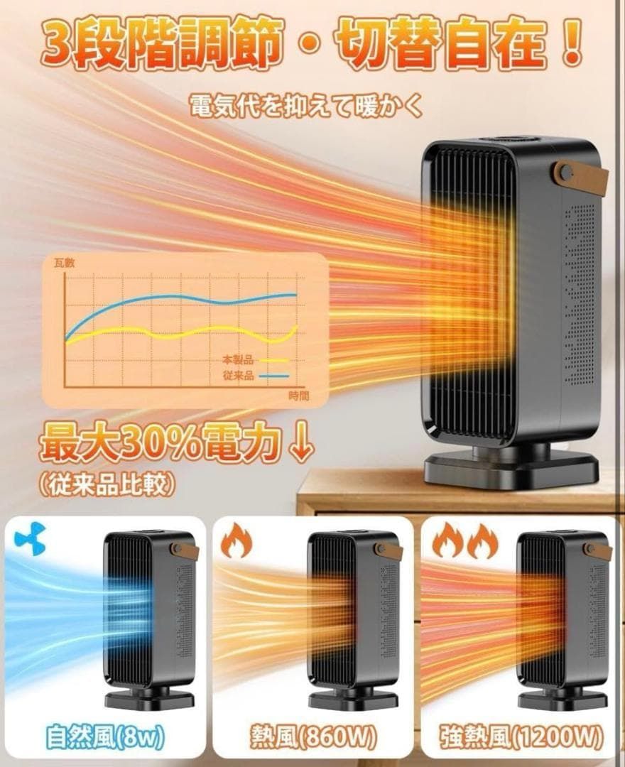 【急速暖房 & 3 段階調節で使い勝手抜群】 高性能 PTC セラミックヒーターが瞬時に熱を発生!朝起きて冷たい手を伸ばす瞬間、スイッチを入れればすぐに暖かさを感じられます。自然風で風通しを良くしたり、弱暖房でゆったりとした居心地を作ったり、強暖房で急いで部屋を暖めたり…… 季節やムードに合わせて自由に調節できるのが魅力です。