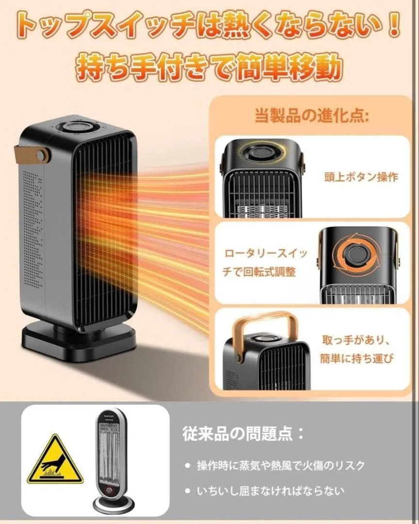 【使いやすさにこだわった操作性】 トップ部分に調節ロータリースイッチを配置し、熱くならない設計になっているので、暖房をつけている最中でも安心してつまみ換えができます(他の製品はロータリースイッチが下にあり、熱くて触れないことが多いのに比べ、圧倒的に使いやすいです。)さらに取っ手が付いているので、リビングから寝室へ、オフィスから車内へと、暖かさを簡単に持ち運べます。