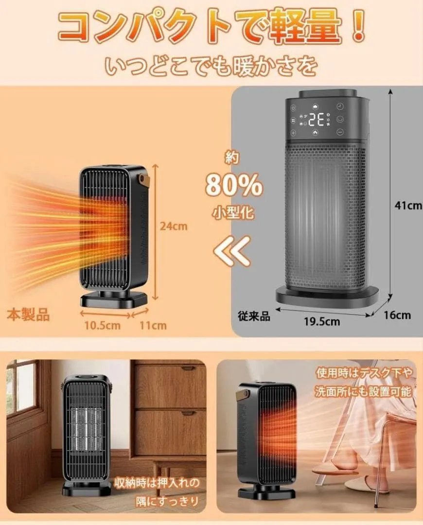 【コンパクトで収納しやすく、多場面で活躍】 わずか 829g の軽さと 24*10.5*11cm のサイズは、簡単に収納します。heater for room 冬のキャンプ場で手元を暖めたり、オフィスのデスク下で足元を温めたり、寝室のベッドサイドで夜中の寒さをしのいだり…… いつどこでも、ちょっとしたスペースに置くだけで快適な小さな「暖かいココロ」を提供します。