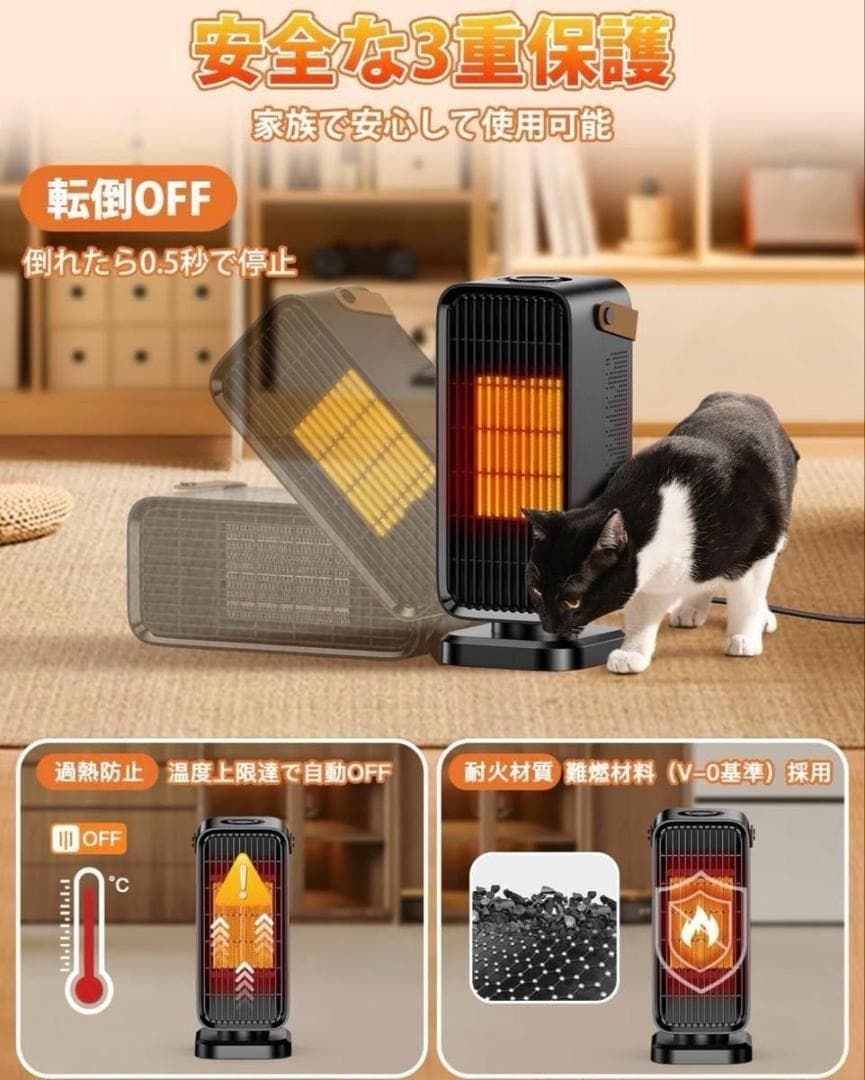 セラミックヒーター 小型 速暖 電気ファンヒーター 省エネ節電 3段階温度調節 大風量 操作簡単 ダイヤル式 転倒OFF 過熱保護 耐火素材 ミニ 暖房器具 電気ストーブ 静音 コンパクト 持ち運び 足元 窓下結露対策 寒さ対策 日本語取扱説明書 ブラック