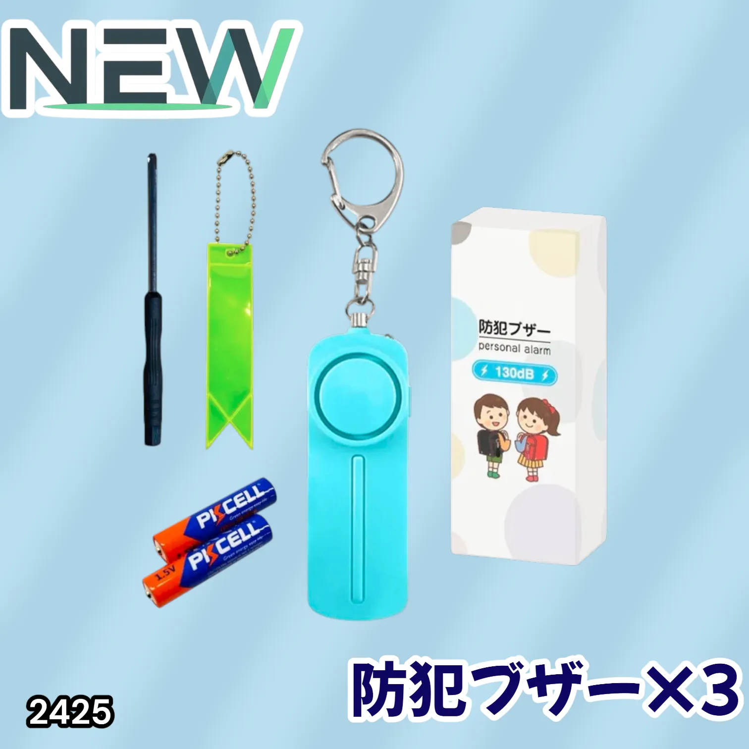 #2425 防犯ブザー ブルー 3個 大音量 女性 小学 LEDライト 防水 130db 電池付き 反射板 キーホルダー 反射板テープ ※北海道、沖縄本島、沖縄の離島、その他離島へは別途配送料有り