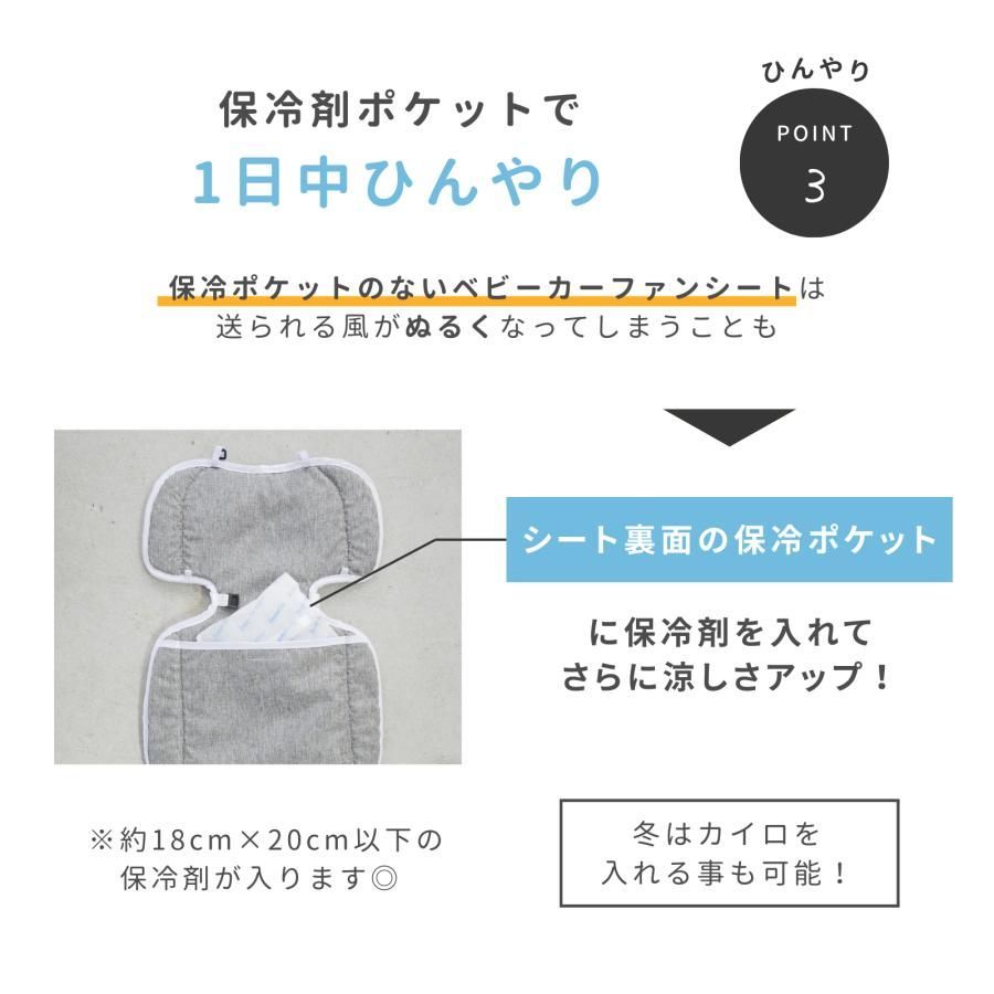 【カラー】ピンク ・猛暑日や酷暑日のお出かけでも、赤ちゃんを素早く冷却できます。 ・サラサラ、ひんやり、気持ちよくスヤスヤ眠れます。 ・冷却ファン&保冷ポケット付きのベビーカーシート。 ・ほぼ全てのベビーカー・チャイルドシート・バウンサーなどに対応! ・お持ちのベビーカー・チャイルドシートの座面に取り付けるだけで装着完了! ・カイロをポケットに入れると、真冬でもご使用いただけます。 ・丸洗いOK!ファンを取り外して洗濯機で繰り返し洗えます。 ・モバイルバッテリー対応。 ・ケーブルに付いたリモコンで風量を3段階調整できます。 ・足元に防水加工を施しているので、雨の日でもご使用いただけます。 ・パッケージも可愛い!出産祝いのプレゼントにおススメです♪