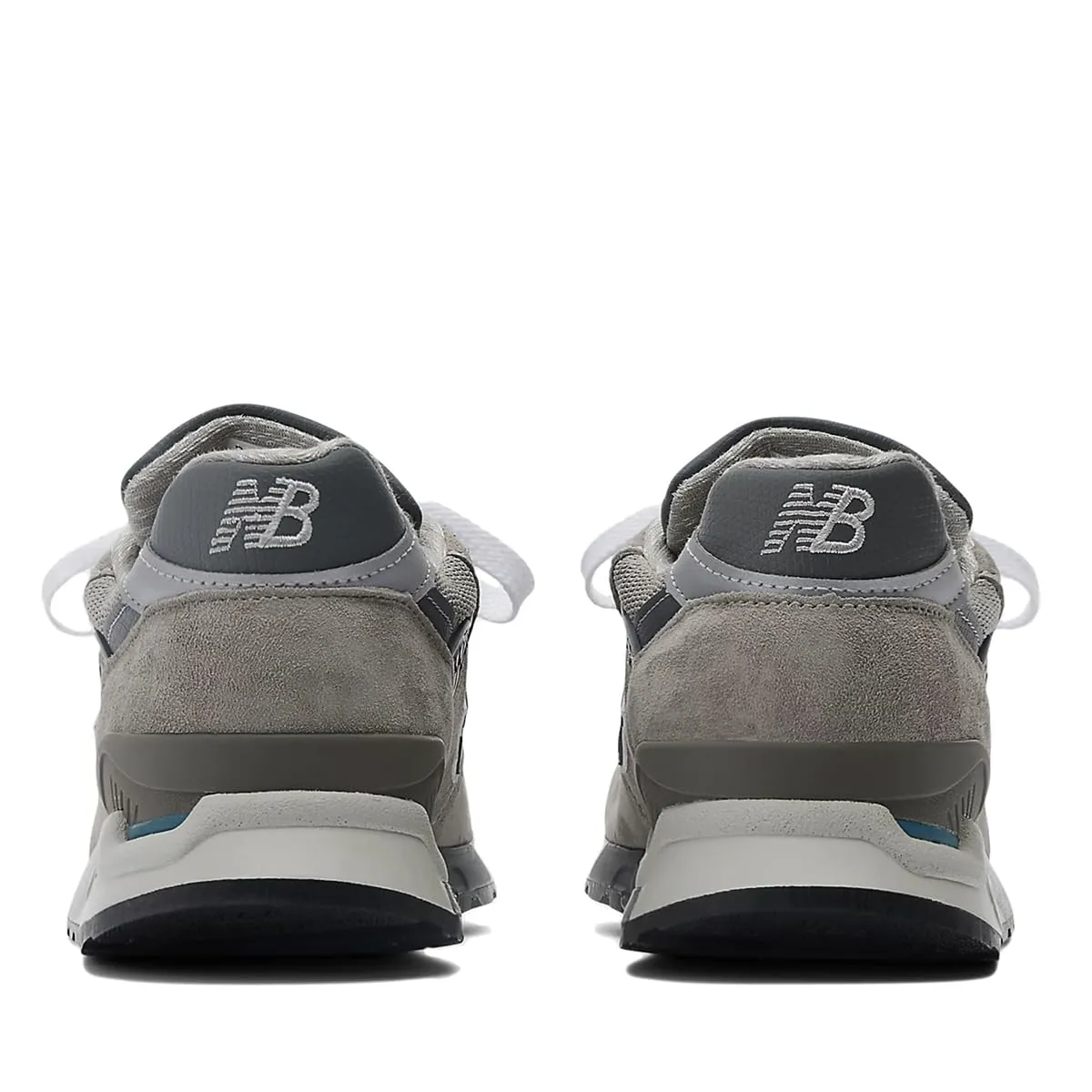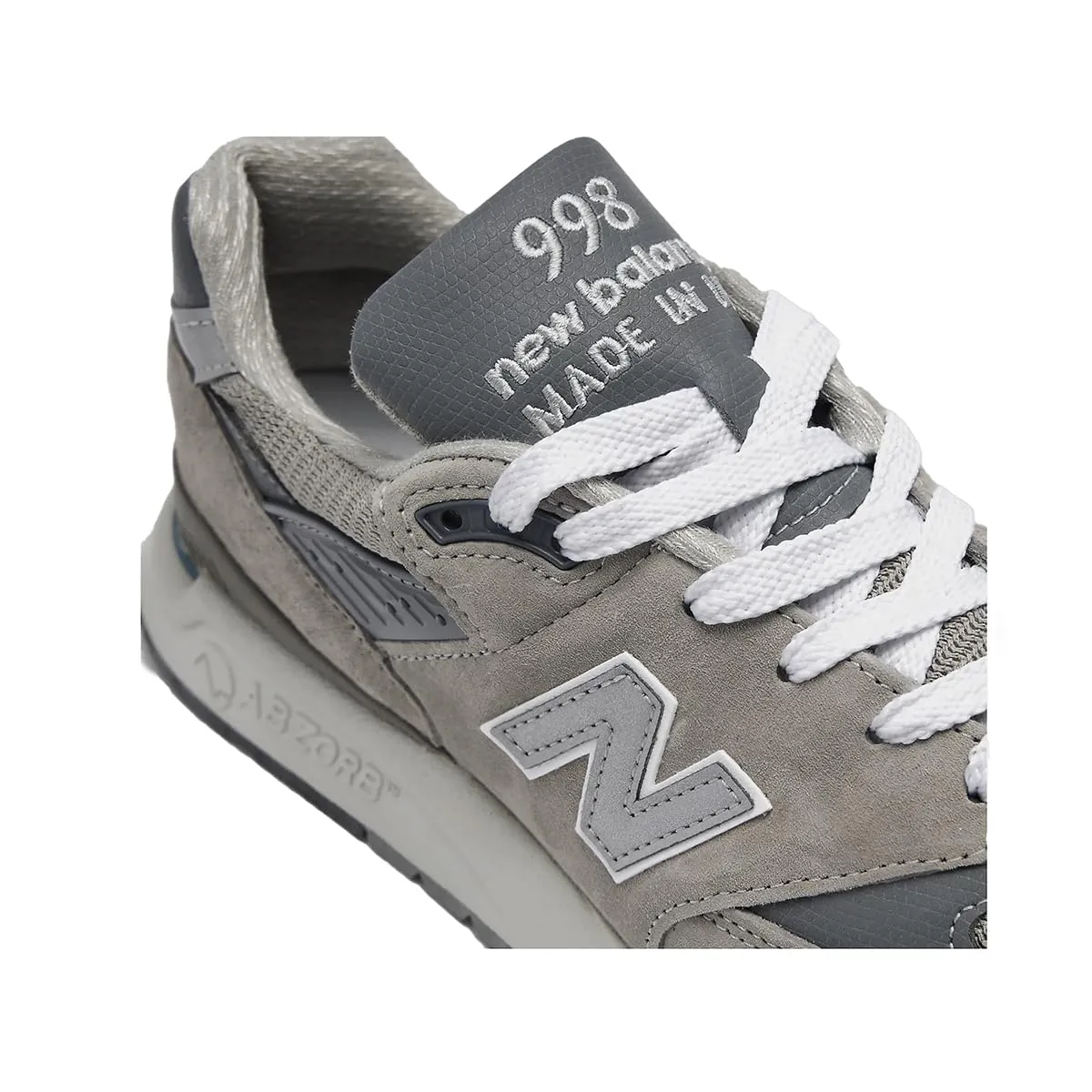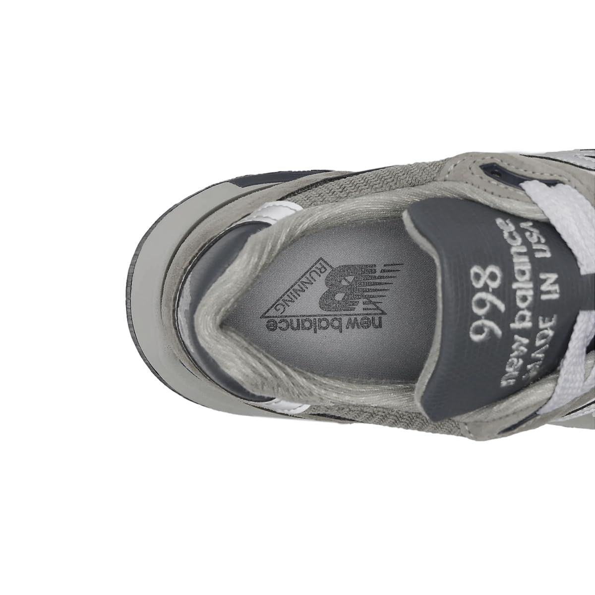 ヒール部分には「998」のロゴ、シュータンには「new balance MADE IN USA」の刺繍があしらわれ、ブランドの歴史と誇りを感じさせます。