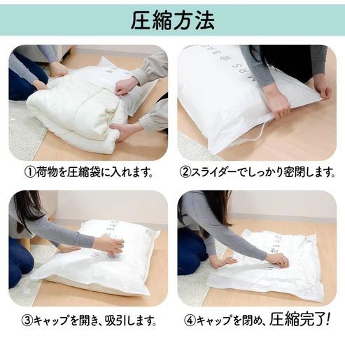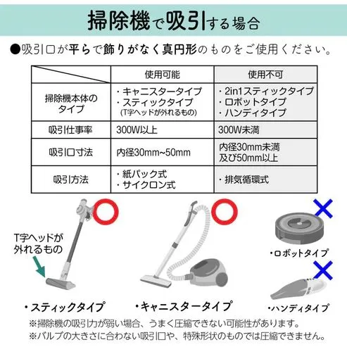 【掃除機で簡単吸引】🧹 ご家庭にある、吸引口が平らで装飾のない真円形の掃除機を使って、簡単に圧縮できます。