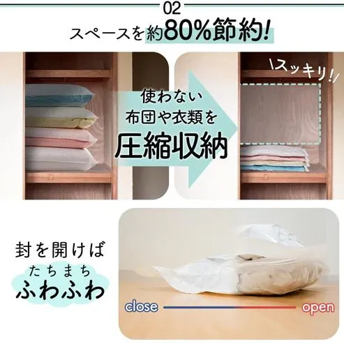【スペースを約80%節約】📦✨ 使わない布団や衣類を圧縮収納することで、押し入れやクローゼットのスペースをすっきり確保できます。 封を開ければ、たちまちふわふわの状態に戻ります😊