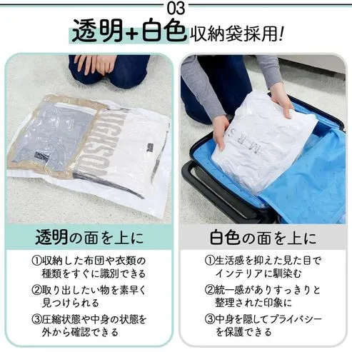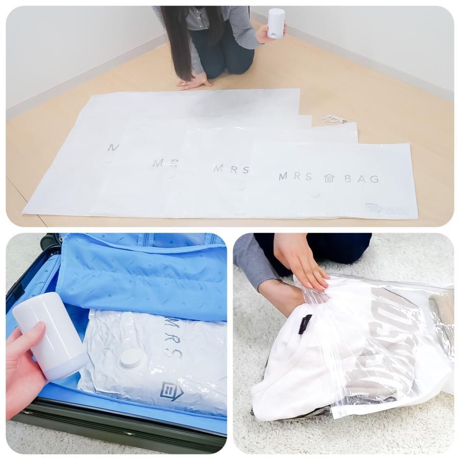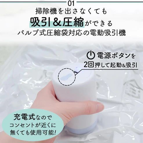【掃除機がなくても安心・電動吸引機セットも選択可能】🔋✨ 充電式の電動吸引機なので、近くにコンセントがない場所でも使用できます。 圧縮袋と電動吸引機を旅行バッグに入れれば、衣類を圧縮してバッグ内をすっきり整理可能です🧳