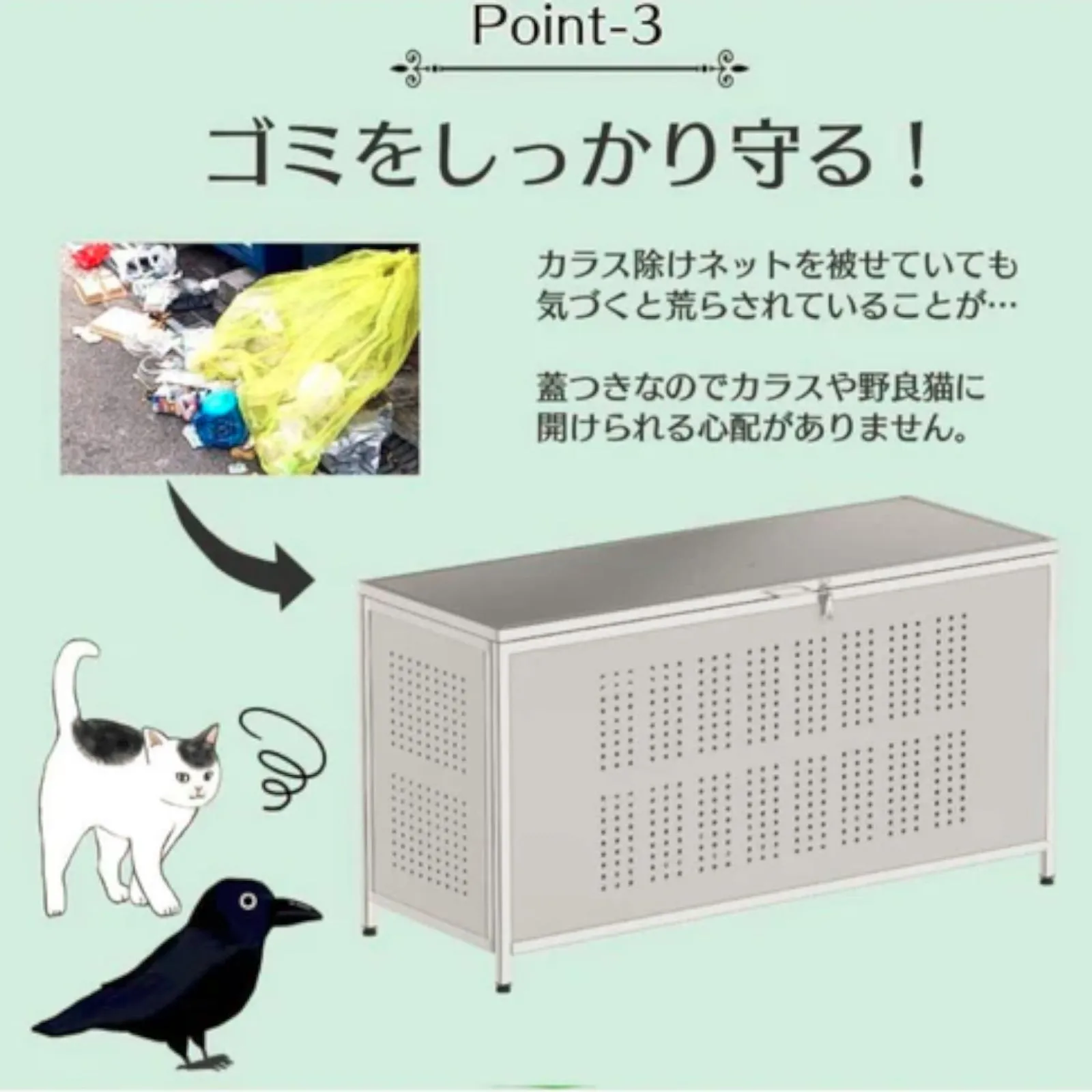 ●同じような蓋つきのゴミ箱でも、網目が大きいと外からもカラスなどの野生動物に荒らされる心配がありますが、従来品より小さく改良し、中に保管しているものを荒らされるストレスから解放されることができるでしょう。カラスなどのクチバシで突かれたり、野良猫やイタチなどからの爪で引っかかれる心配はありません。