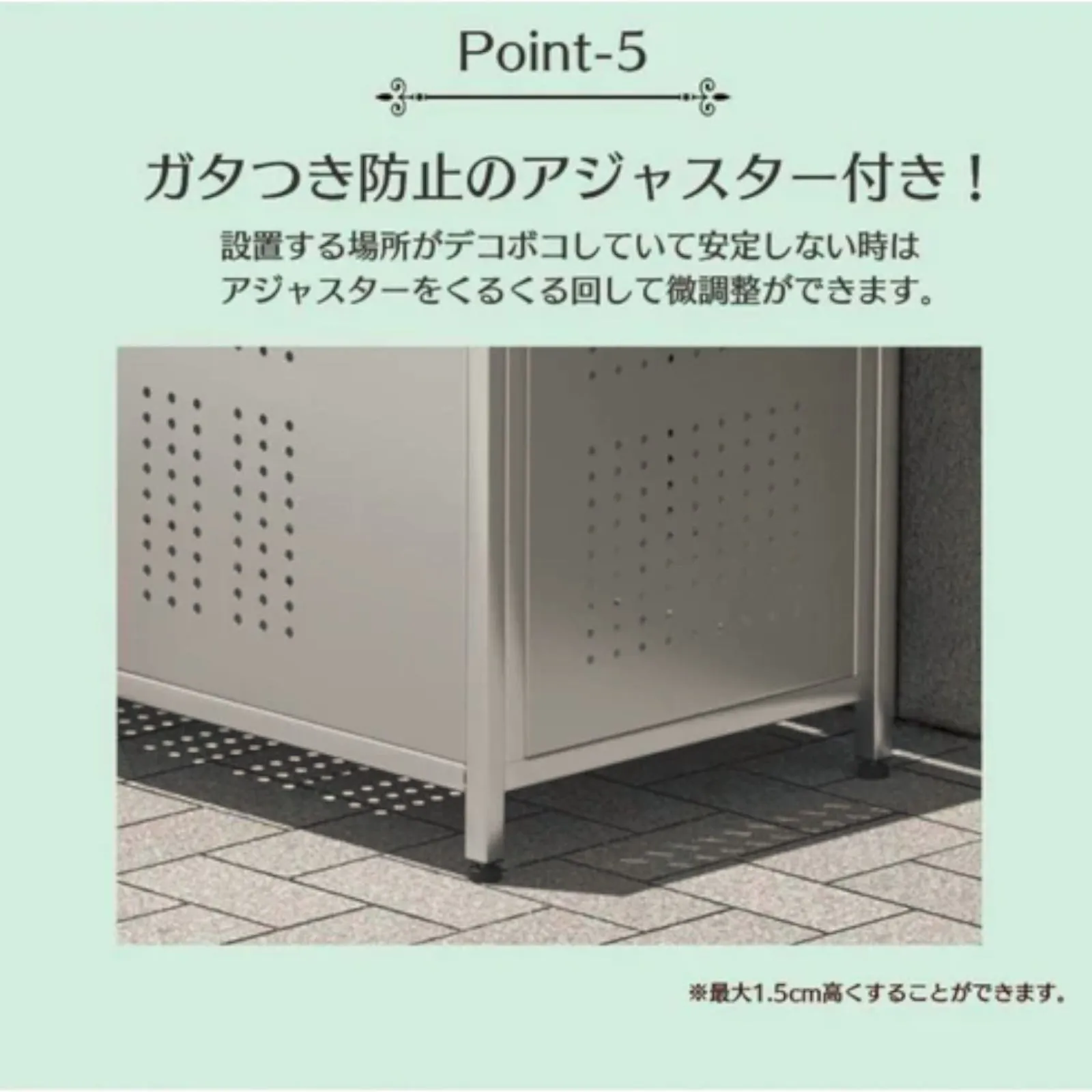 ●脚は充分な高さがあり、地面から離れているので水たまりなどの影響も受けません。 また、高さ調整ができるアジャスターがついていて、ガタつきがある設置場所でも安定して設置ができます。