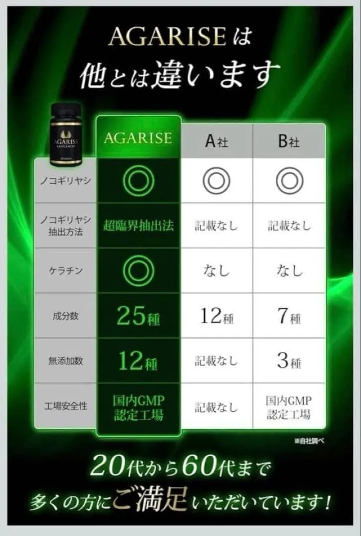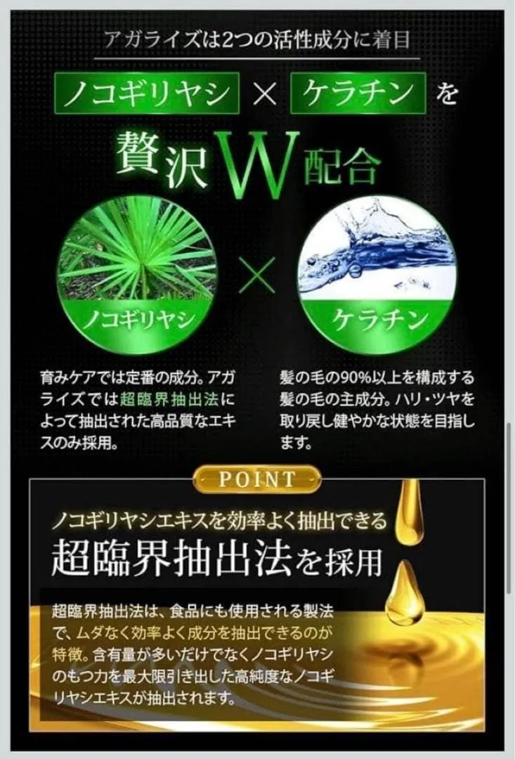 【ノコギリヤシ×ケラチン独自配合】 どんな良い成分も入れすぎはよくありません。サプリメントも配合バランスが大切。AGARISE(アガライズ)は特許成分や栄養成分など研究を重ね、試行錯誤の結果たどり着いた黄金比で配合した抜け目のないサプリメントです。