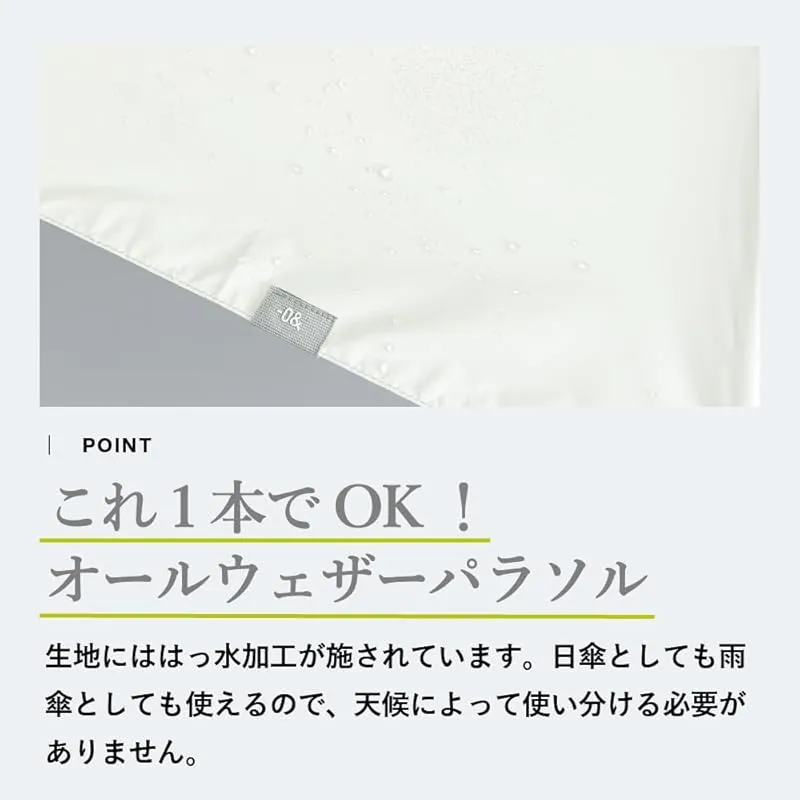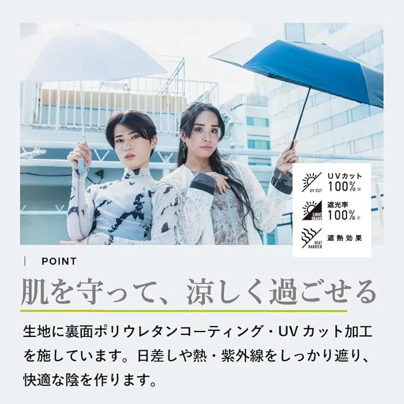 【雨の日も使える晴雨兼用日傘】裏側コーティングでUVカット率、遮光率は99.9%。遮熱効果付き、UPF50+という高機能タイプの日傘です。日傘としてだけでなく、生地にははっ水加工が施されており、雨の日でもご利用いただけます。