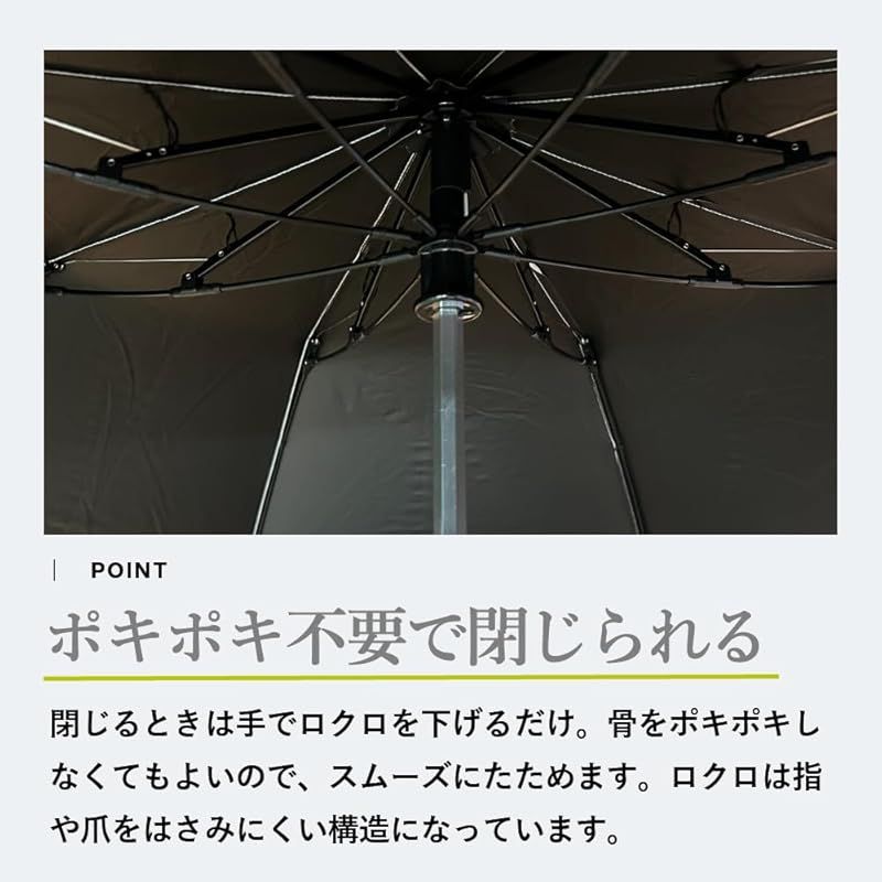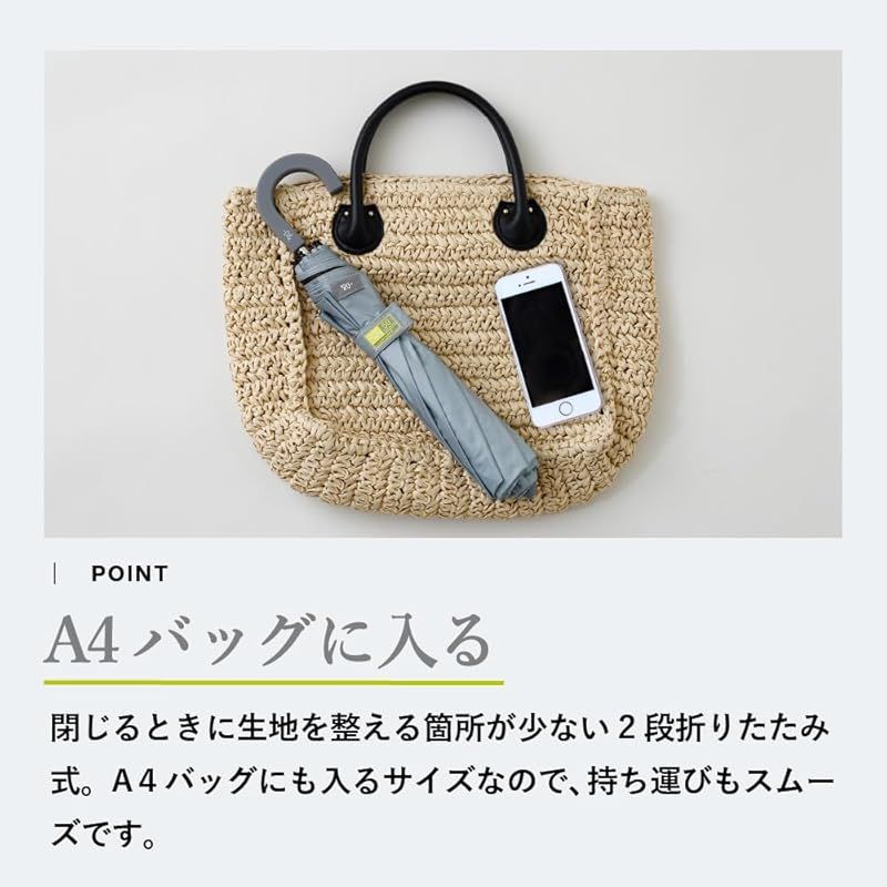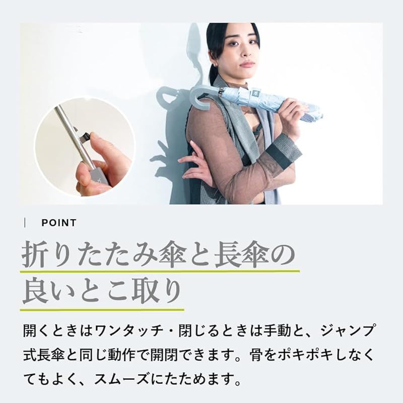【折りたたみ傘が苦手な人のための日傘】折りたたみ傘がうまくたためない。たたむのが面倒だから使いたくない。そんなシーンや用途に合わせて作られた日傘です。形状や見た目は折りたたみ傘ですが、実際には通常のジャンプ傘と変わらない作りになっていおり、非常に畳みやすくなっています。サイズは折りたたみ傘と同じなのでカバンに入れて持ち運びも可能です。折りたたみ傘が苦手だった方も是非使っていただきたい傘です。