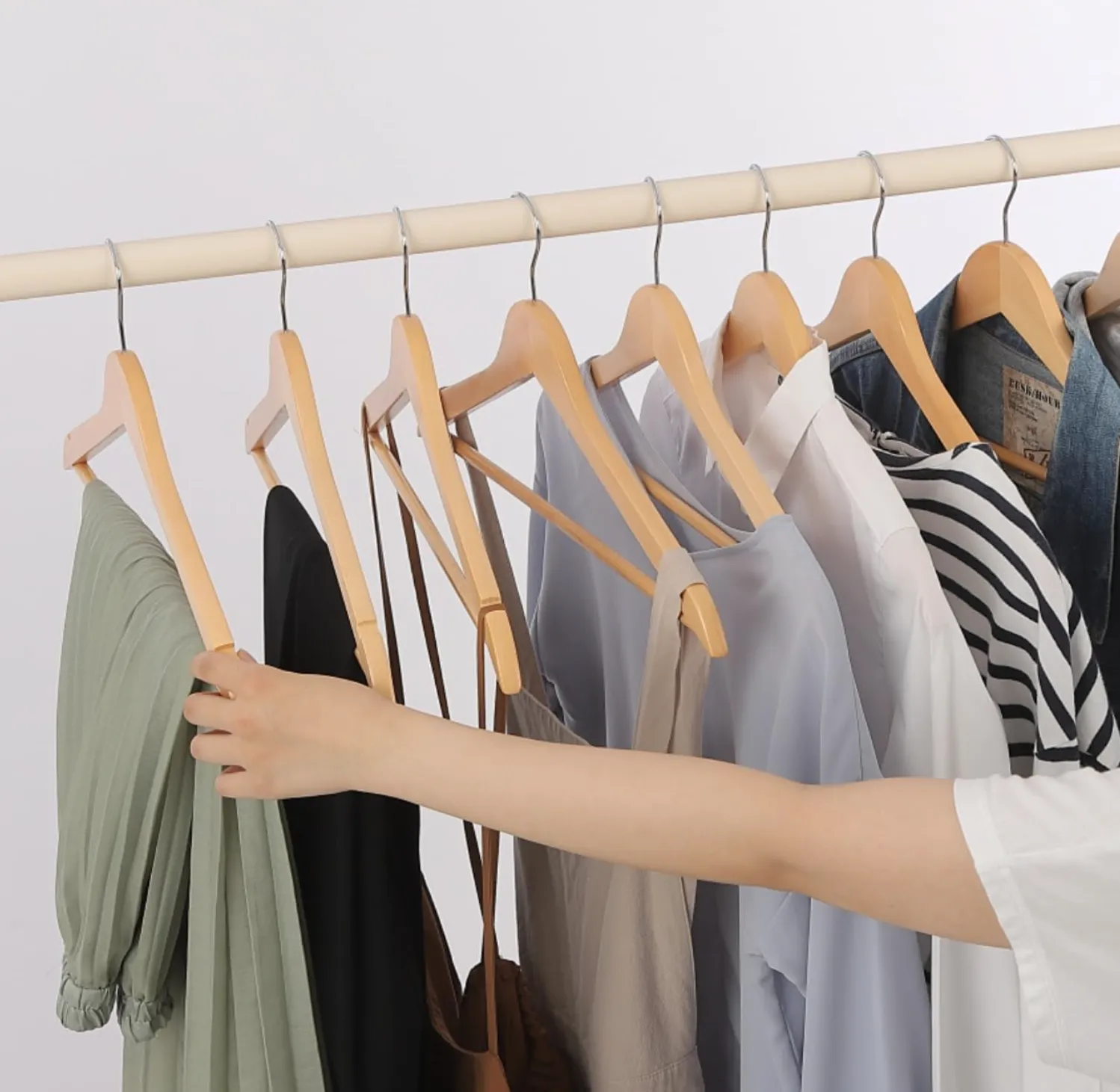 【仕様・スペック】 ・サイズ:幅 約44cm ・セット内容:20本 ・仕様:肩紐用の溝あり、フック回転式 ・材質:木製