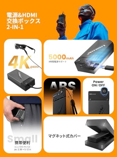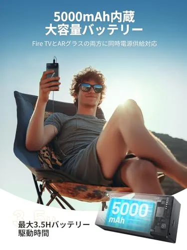 【5000mAh大容量バッテリー、長時間駆動】:大容量リチウムポリマーバッテリーを内蔵し、連続視聴をサポートし、フル充電で4時間駆動します(Fire TV StickARグラスの組み合わせ)。電源インジケーターライトがリアルタイムで残量をお知らせし、アウトドアでの電源不安を解消します。