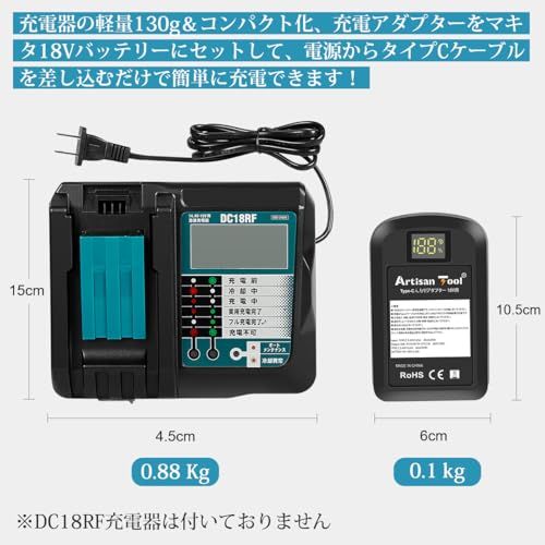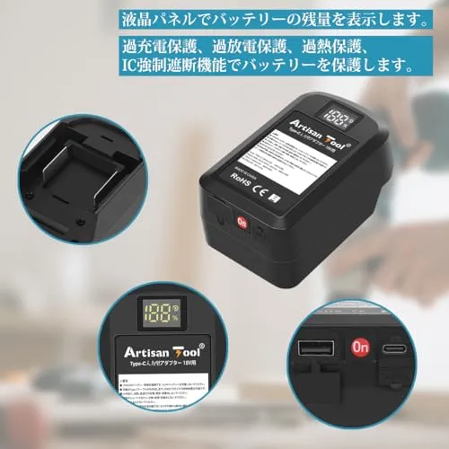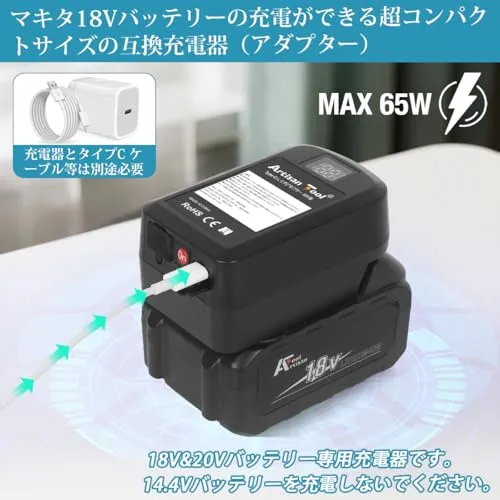 アルチザンツール【日本ブランド】互換充電器Type-C入力型アダプター 黒 マキタ18V専用 バッテリー互換充電アダプタ タイプC充電器アダプター AT-ADTC01b (充電可能)BL1860B/BL1840B/BL1850B/BL1830B/BL1shun