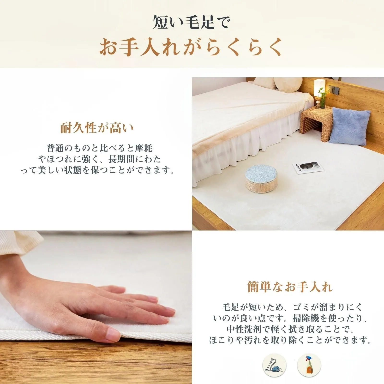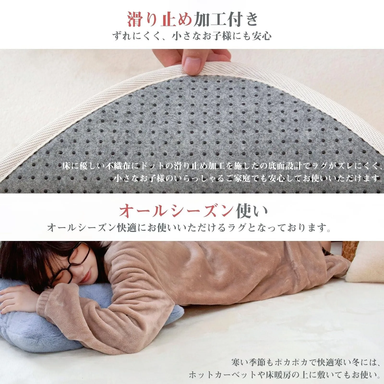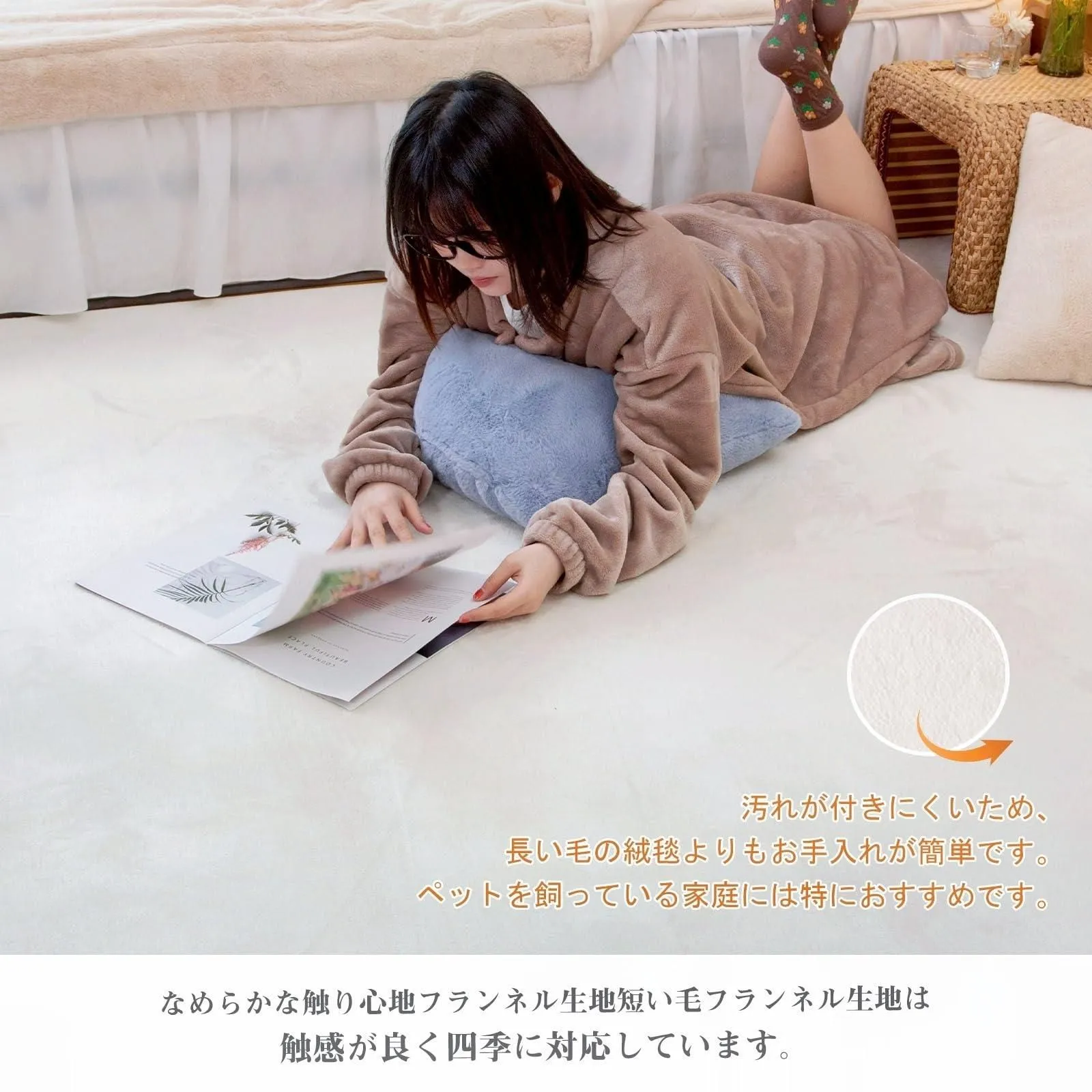 【オールシーズン快適ラグ】高品質のショートパイルフランネル素材が肌触りの良い通気性を実現。 裸足でも気持ちよく、季節を問わずサラサラとした肌触りで快適にお使いいただけます。 冬場の床暖房にも対応しています。